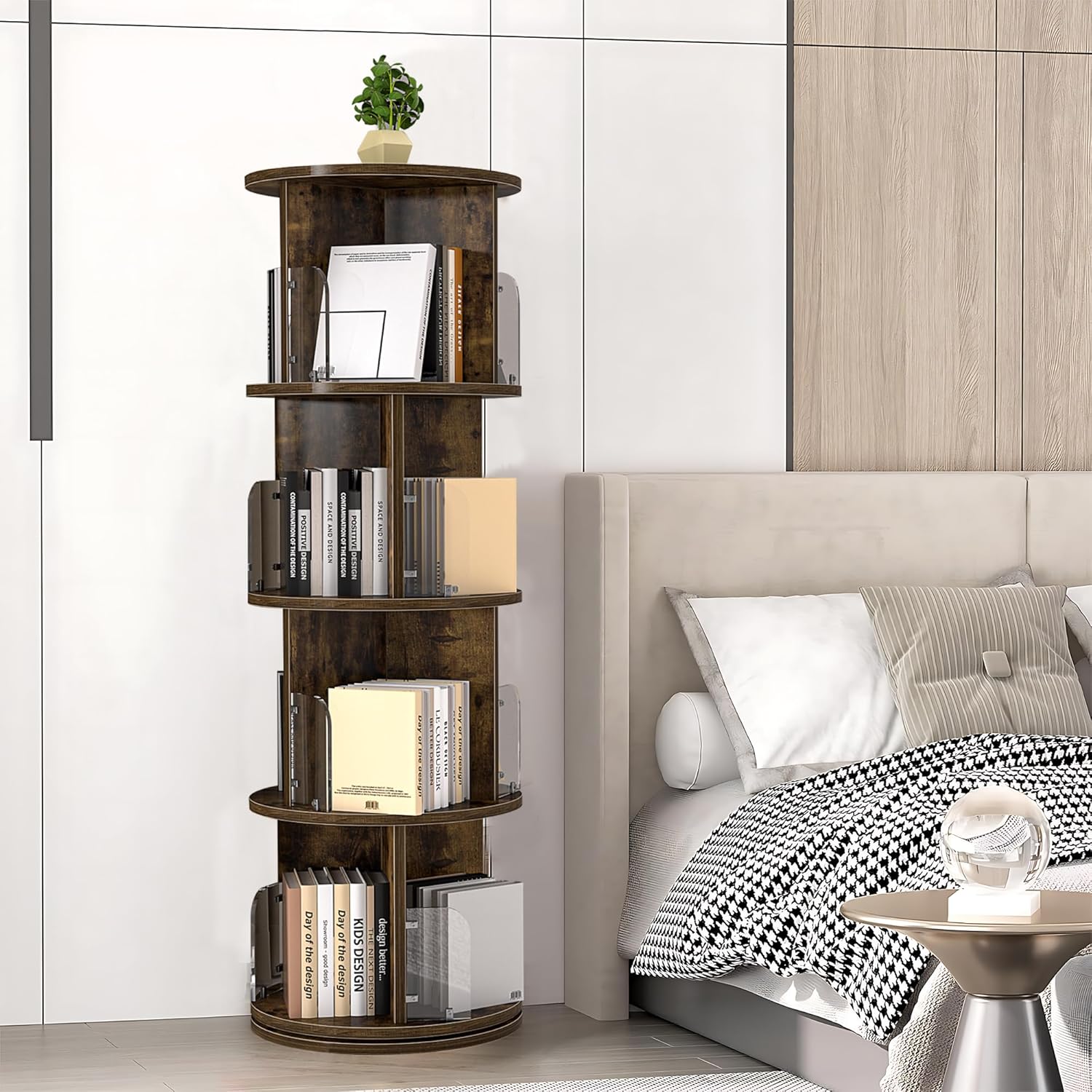 - 【Widely Used】 It is not only a rotating bookshelf, but can also be used as a display cabinet or storage rack for daily necessities, making it an excellent choice for you to place in your bedroom, office or living room. Even if you can put it in the kitchen, the rotating design allows you to store more spices, kitchen utensils, and it is also more convenient to pick up. Using your imagination, the universal rotating frame is suitable for your family.