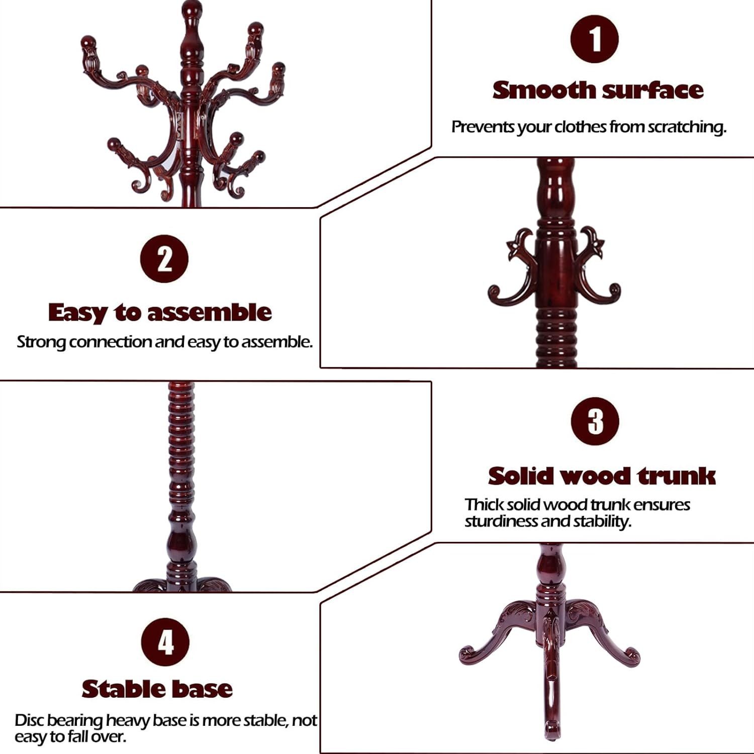 - PROCESS MATERIAL SAFETY: Our coat rack wood is made of natural solid wood and multiple polishing techniques, carefully crafted by veteran artisans, coated with eco-friendly paints, and the overall shape is vintage and generous, which will bring you an ultra-sturdy and durable coat rack for your healthy life!