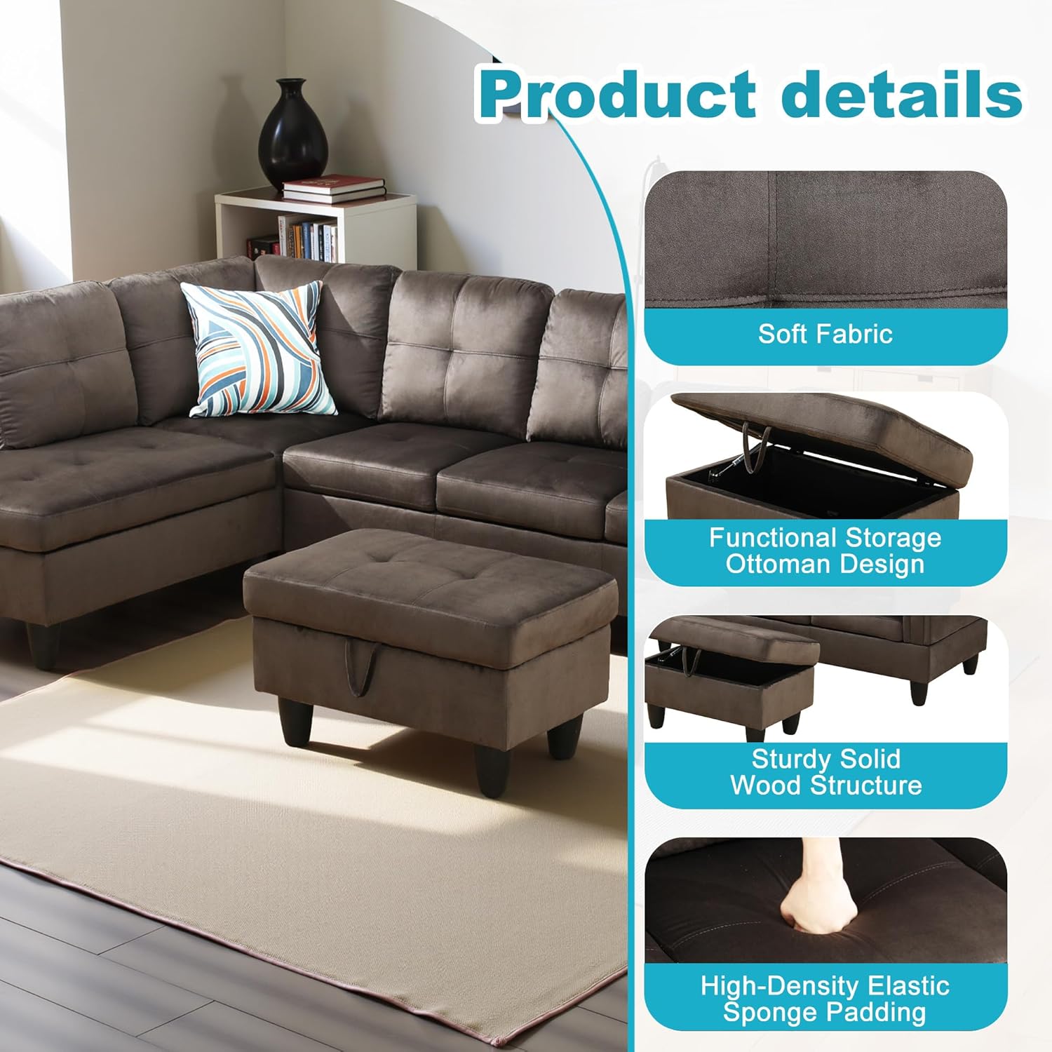 - Versatile and Practical Design: The chaise lounge setup allows for flexibility in your seating arrangement, enabling you to adjust the sofa to fit your space. The included storage ottoman adds functionality, offering a handy way to keep your living area neat and orderly.