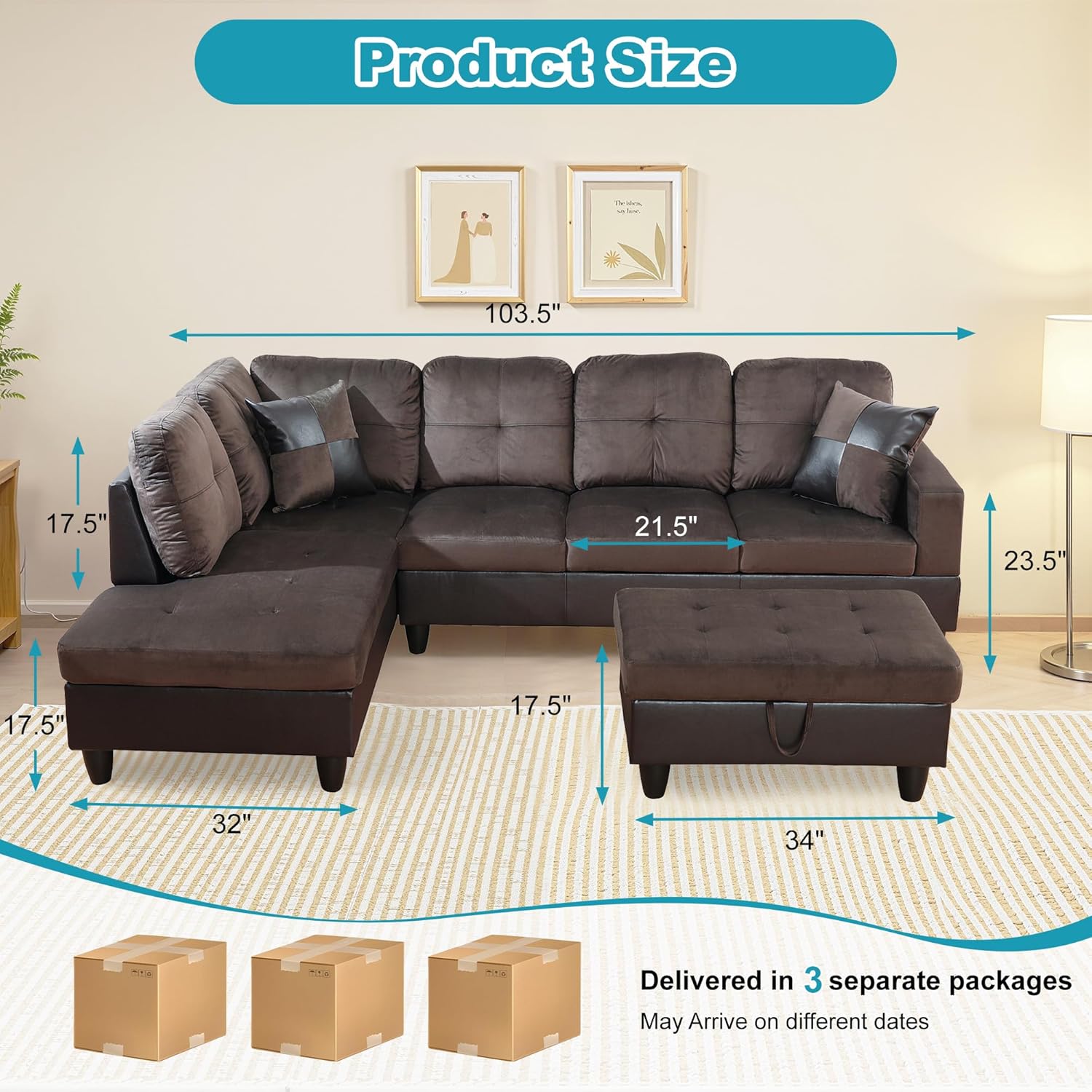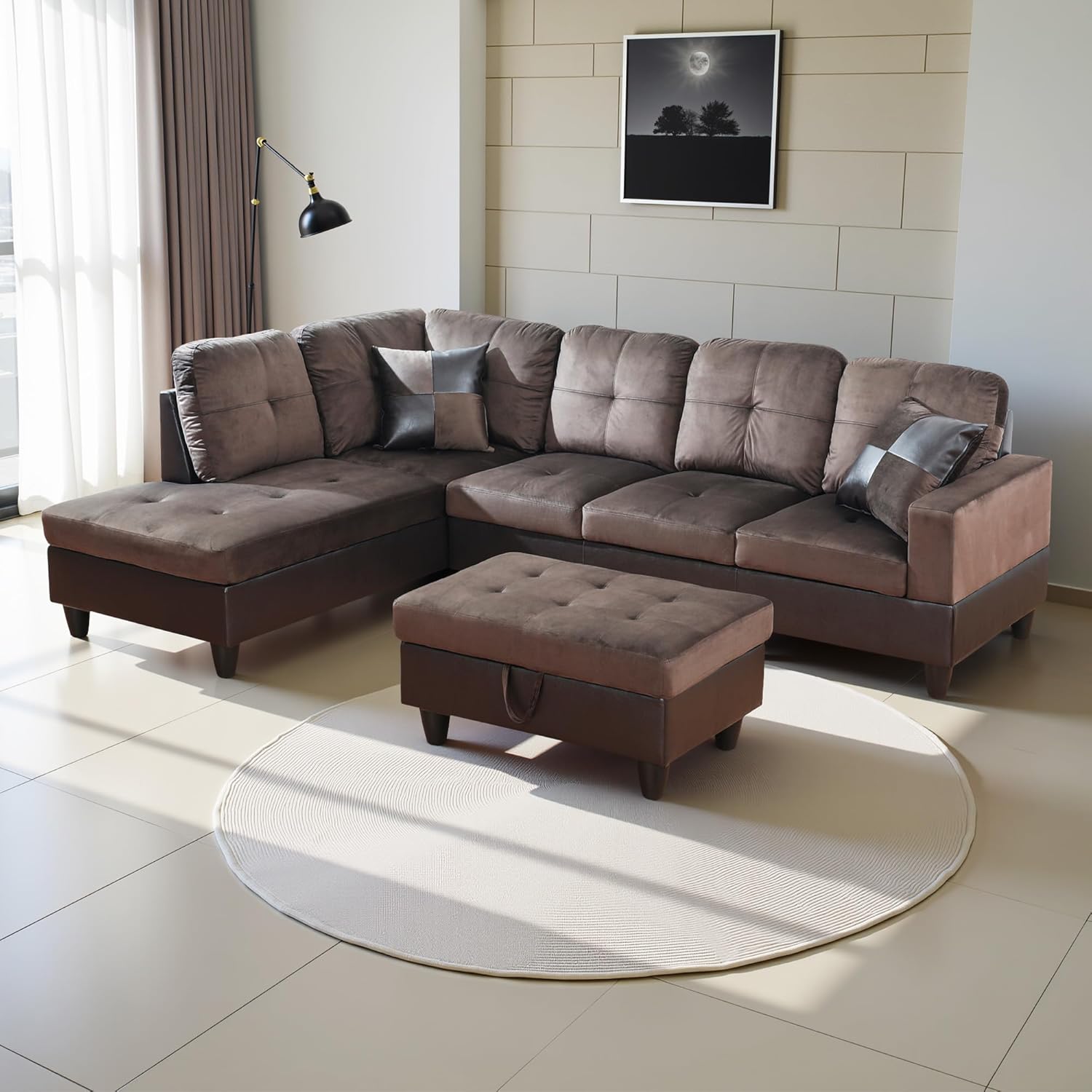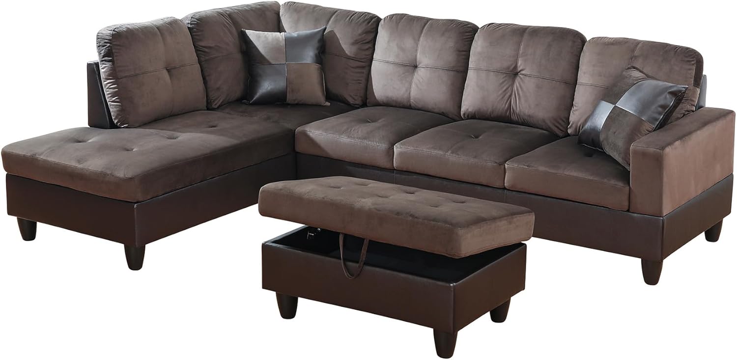 - Versatile and Practical Design: The chaise lounge setup allows for flexibility in your seating arrangement, enabling you to adjust the sofa to fit your space. The included storage ottoman adds functionality, offering a handy way to keep your living area neat and orderly.