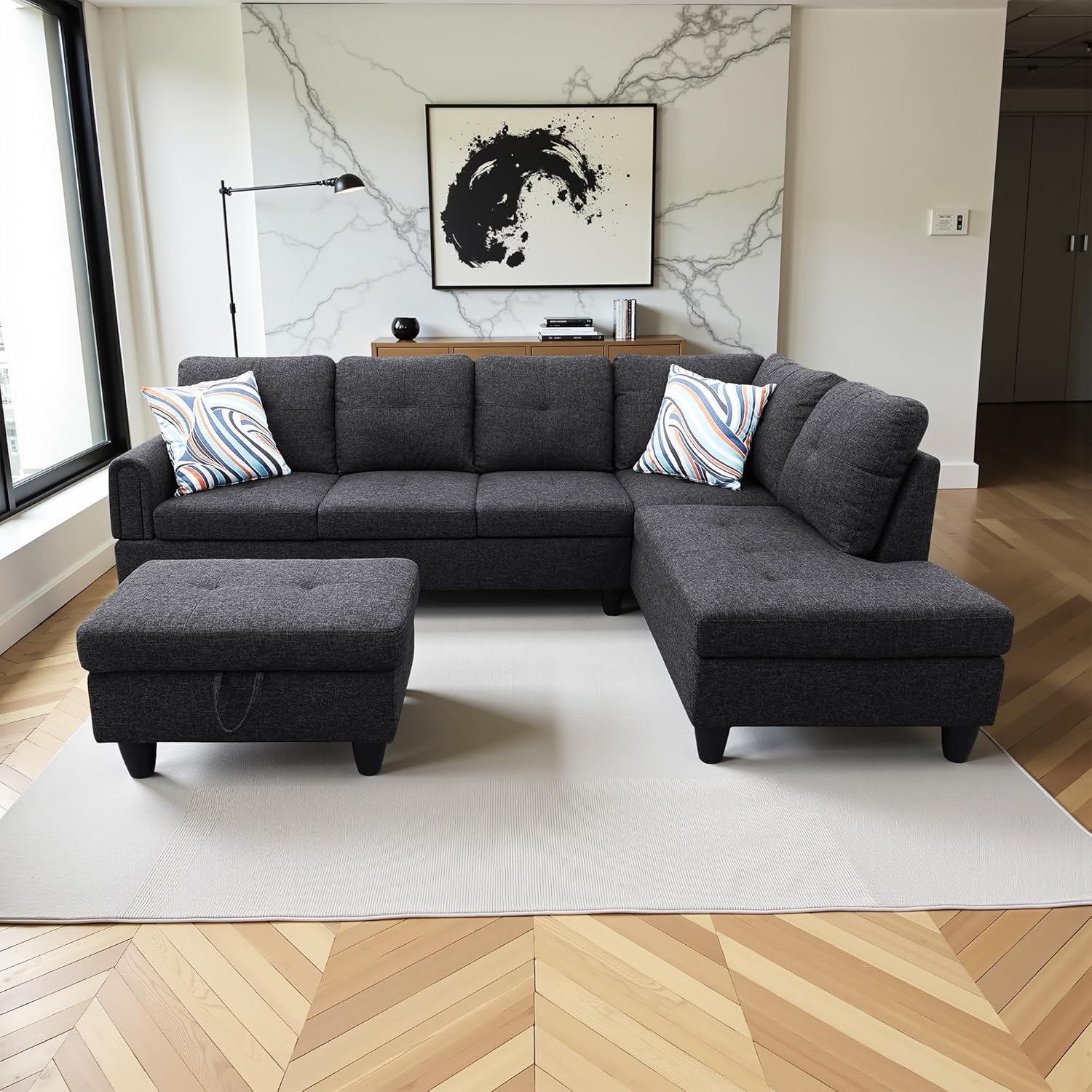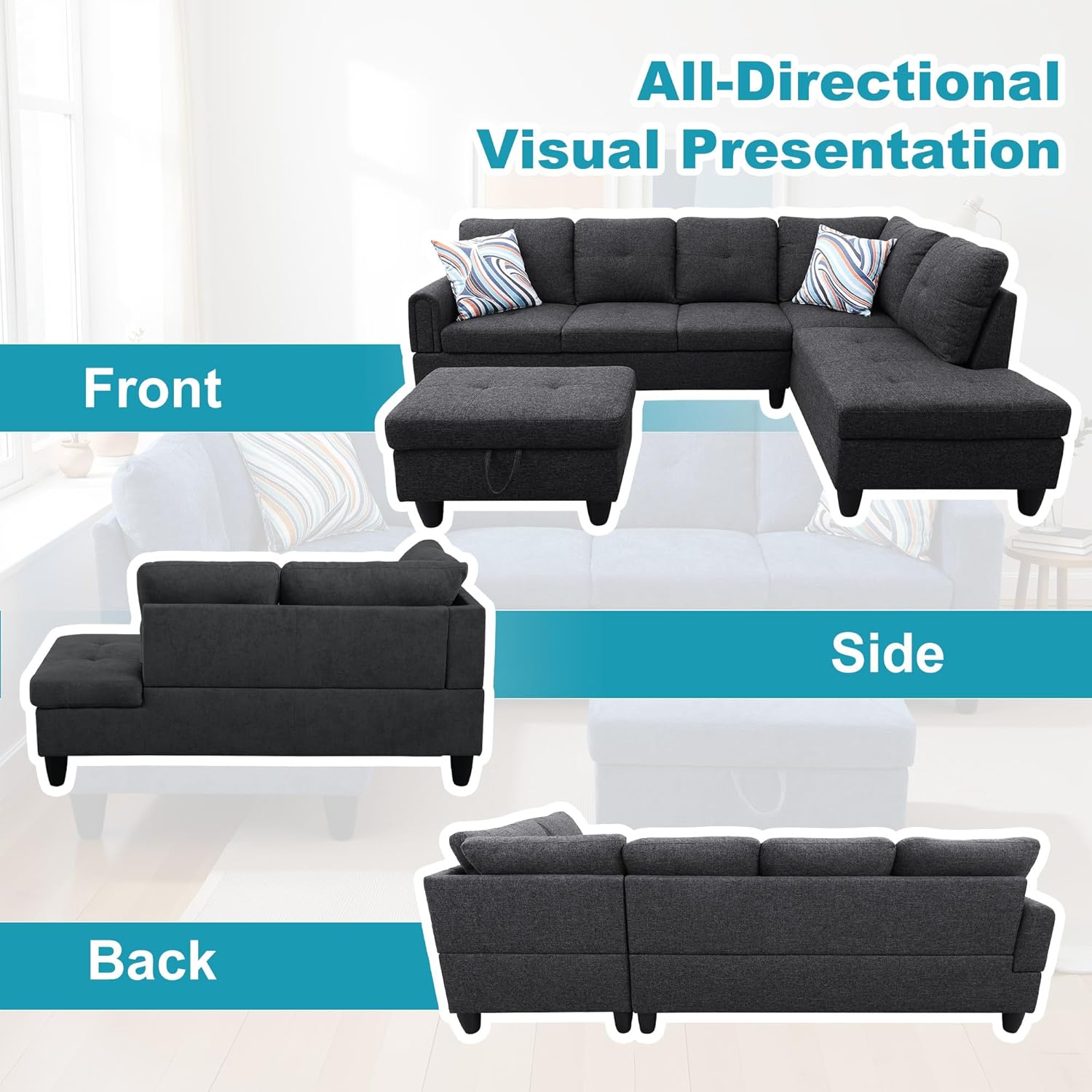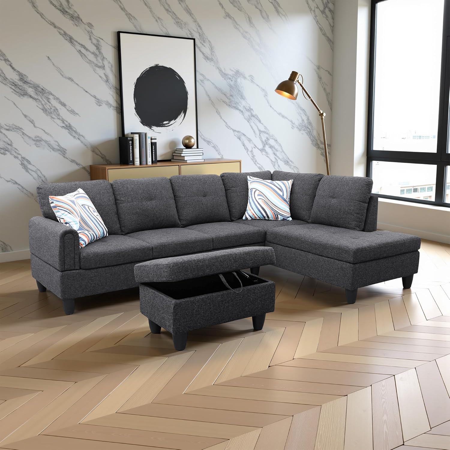 Couches for Living Room Modern L Shaped Couch Comfy Linen Fabric 3 Pieces Sectional Sofa with Chaise, Ottoman with Storage for Office and Small Apartment, Dark Grey