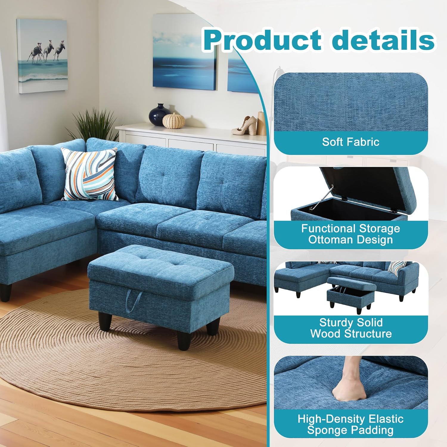 - Versatile and Practical Design: The chaise lounge setup allows for flexibility in your seating arrangement, enabling you to adjust the sofa to fit your space. The included storage ottoman adds functionality, offering a handy way to keep your living area neat and orderly.