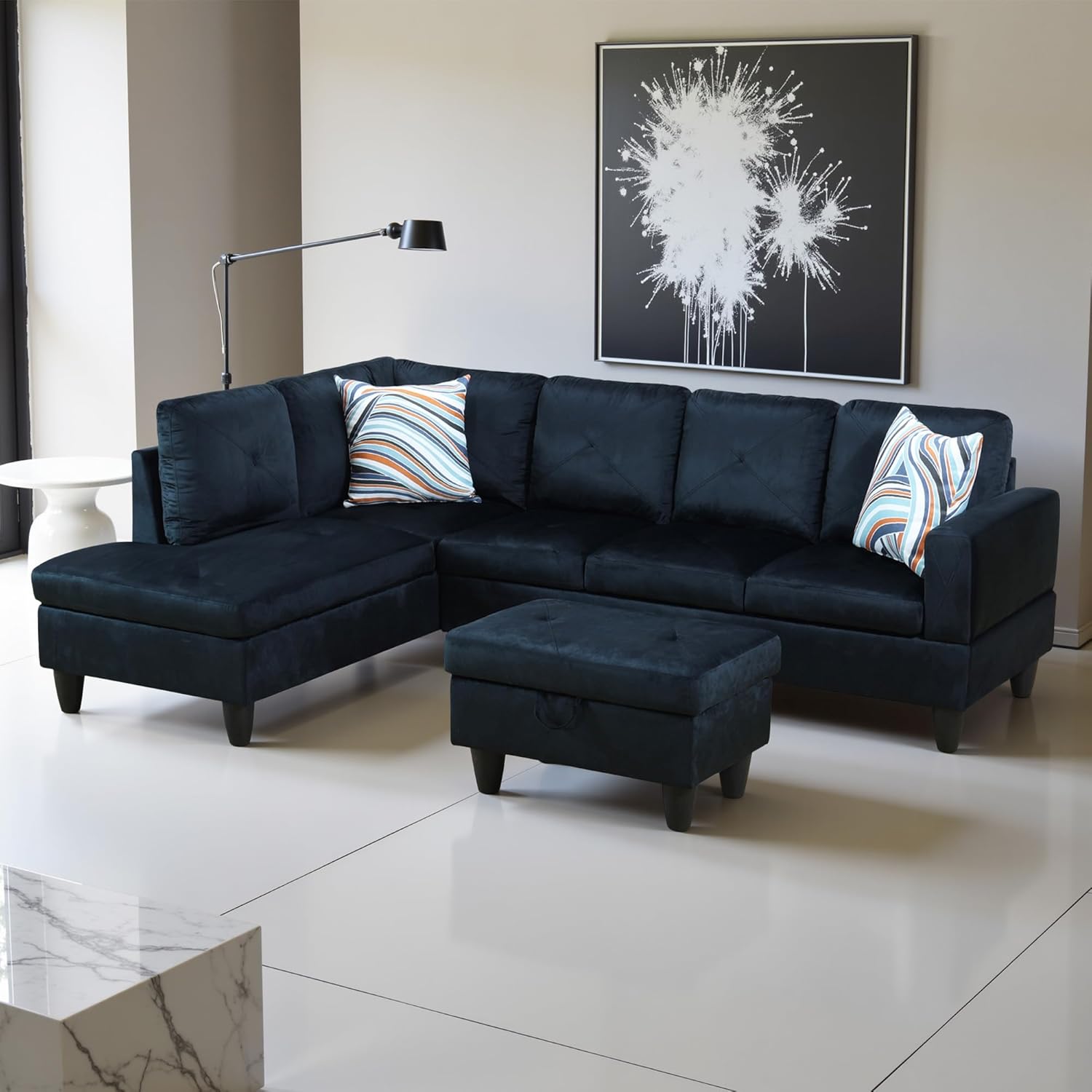 L Shaped Couch Modern Sectional Couch Upholstered Microfiber Fabric 3 Pieces Sofas for Living Room with Chaise, Storage Ottoman for Office and Small Apartment, Midnight Blue