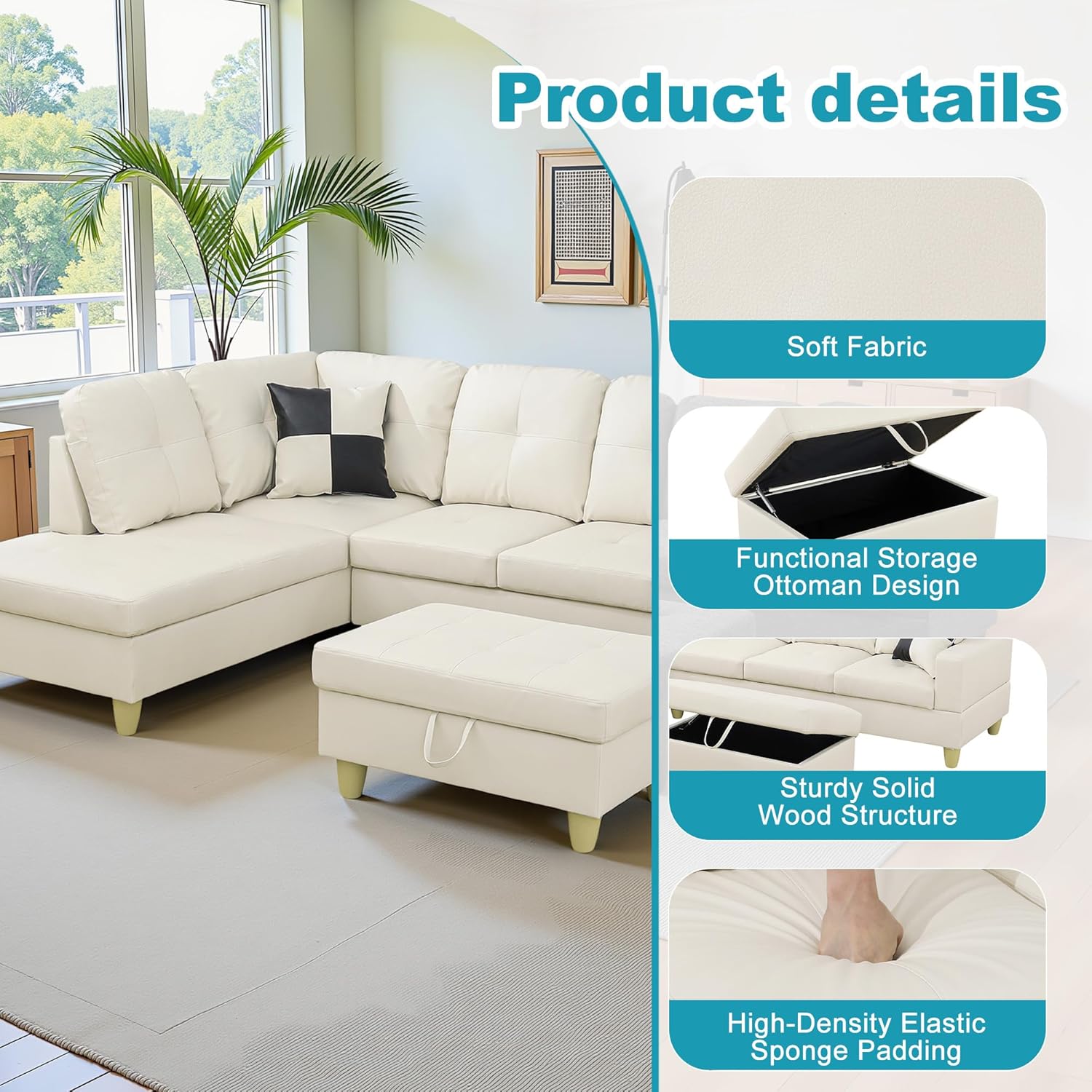 L Shaped Couch Faux Leather Sectional Couch Upholstered 3 Pieces Sofas for Living Room with Chaise, Storage Ottoman for Office and Small Apartment, White