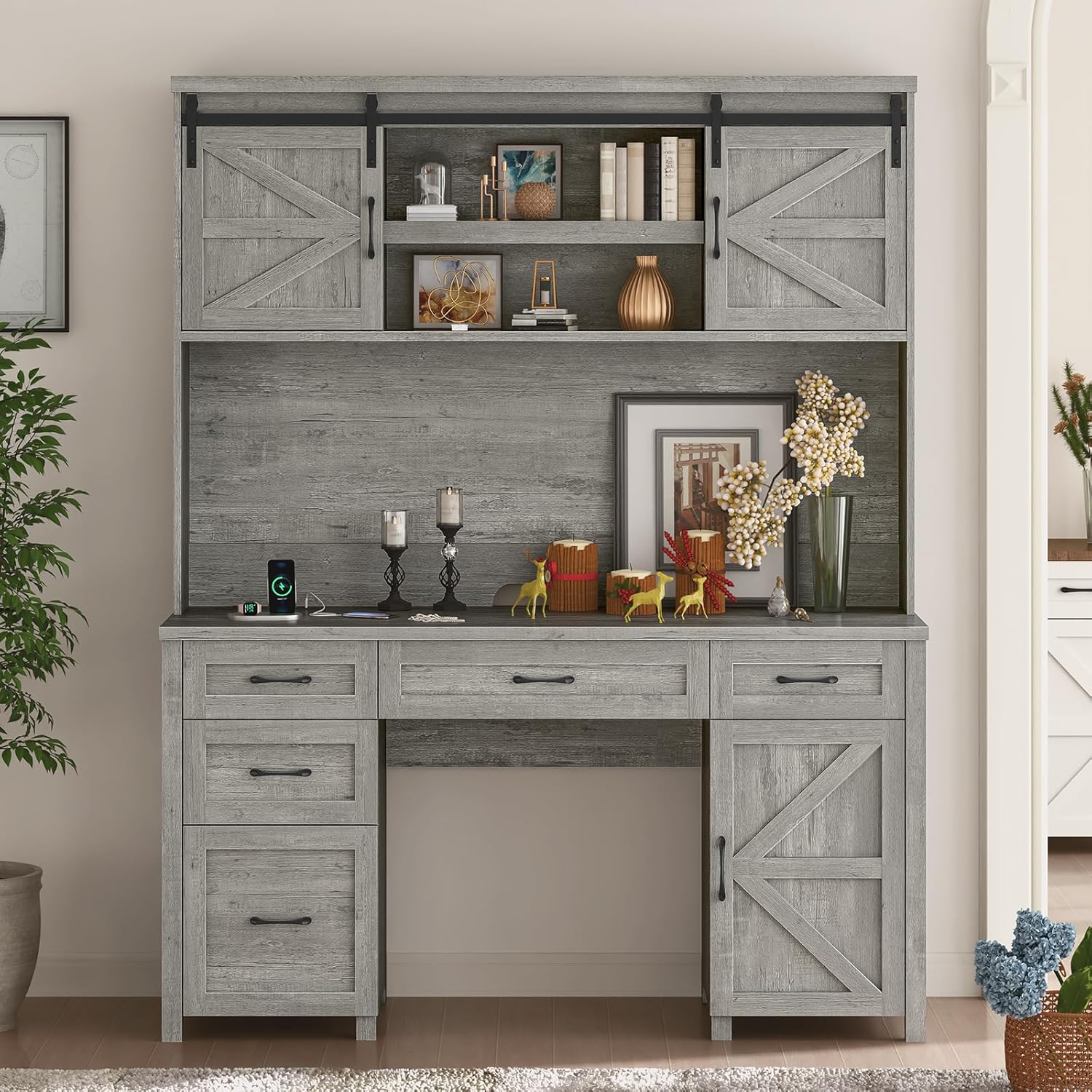 67''H Farmhouse Executive Desk with Hutch & 5 Drawers, Rustic Office Desks Computer Desks with Charging Station, File Drawers and Storage Cabinets, Wood Workspace for Home Office & Study,Grey.