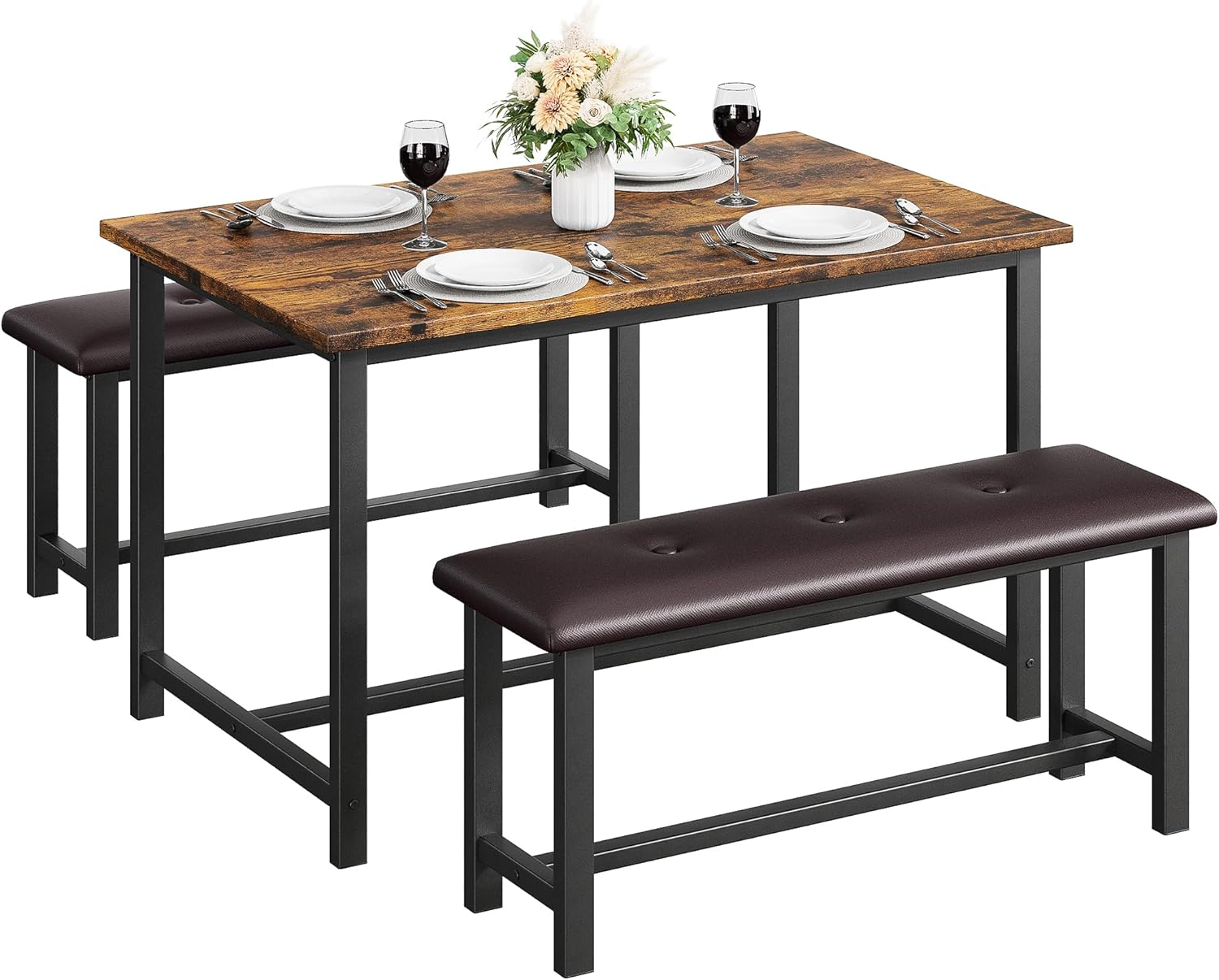 Dining Table Set for 4, Kitchen Table with 2 Upholstered Benches, 3-Piece Dining Room Set for Kitchen, Apartment and Small Spaces, Brown