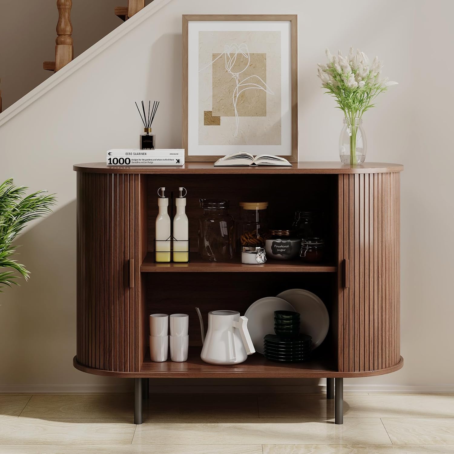 Buffet Sideboard Cabinet with Storage, 40" Fluted Cabinet with Sliding Door & Adjustable Shelf, Modern Accent Coffee Bar Console Table for Kitchen, Entryway, Walnut