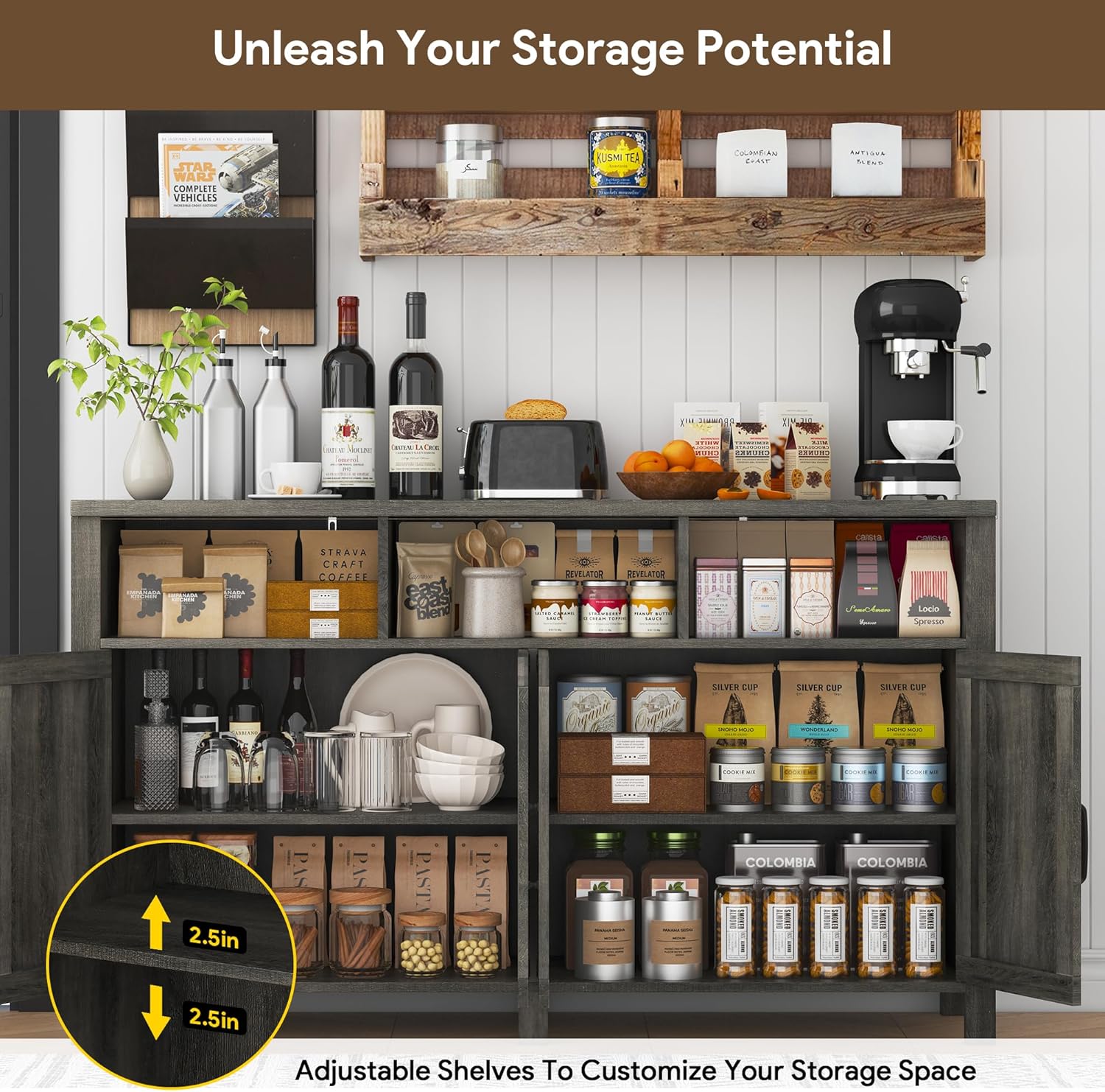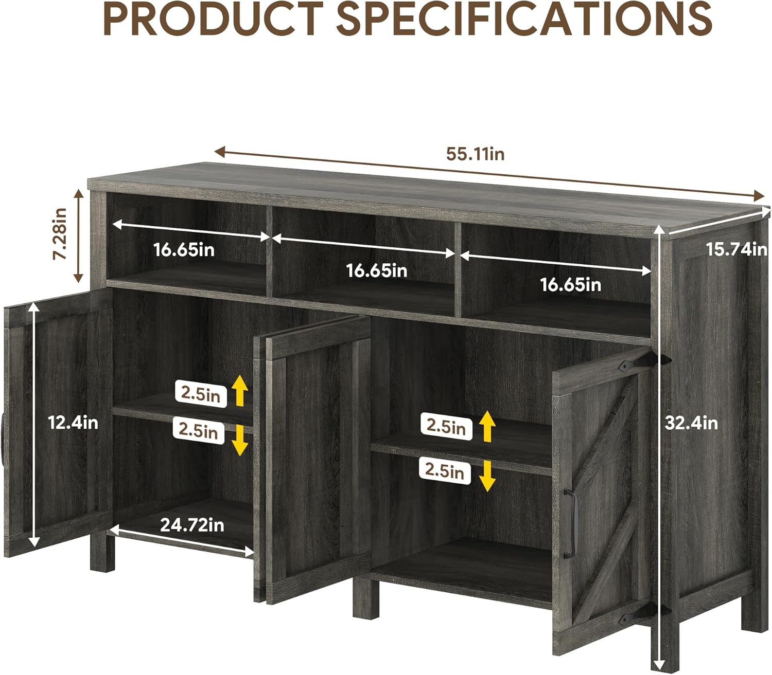 Buffet Sideboard with Storage Farmhouse with 4 Doors, 55'' Large Kitchen Storage Cabinet Wood Coffee Bar Cabinet Buffet Table with Shelves for Kitchen, Dining Room, Entryway (Gray, 55in)