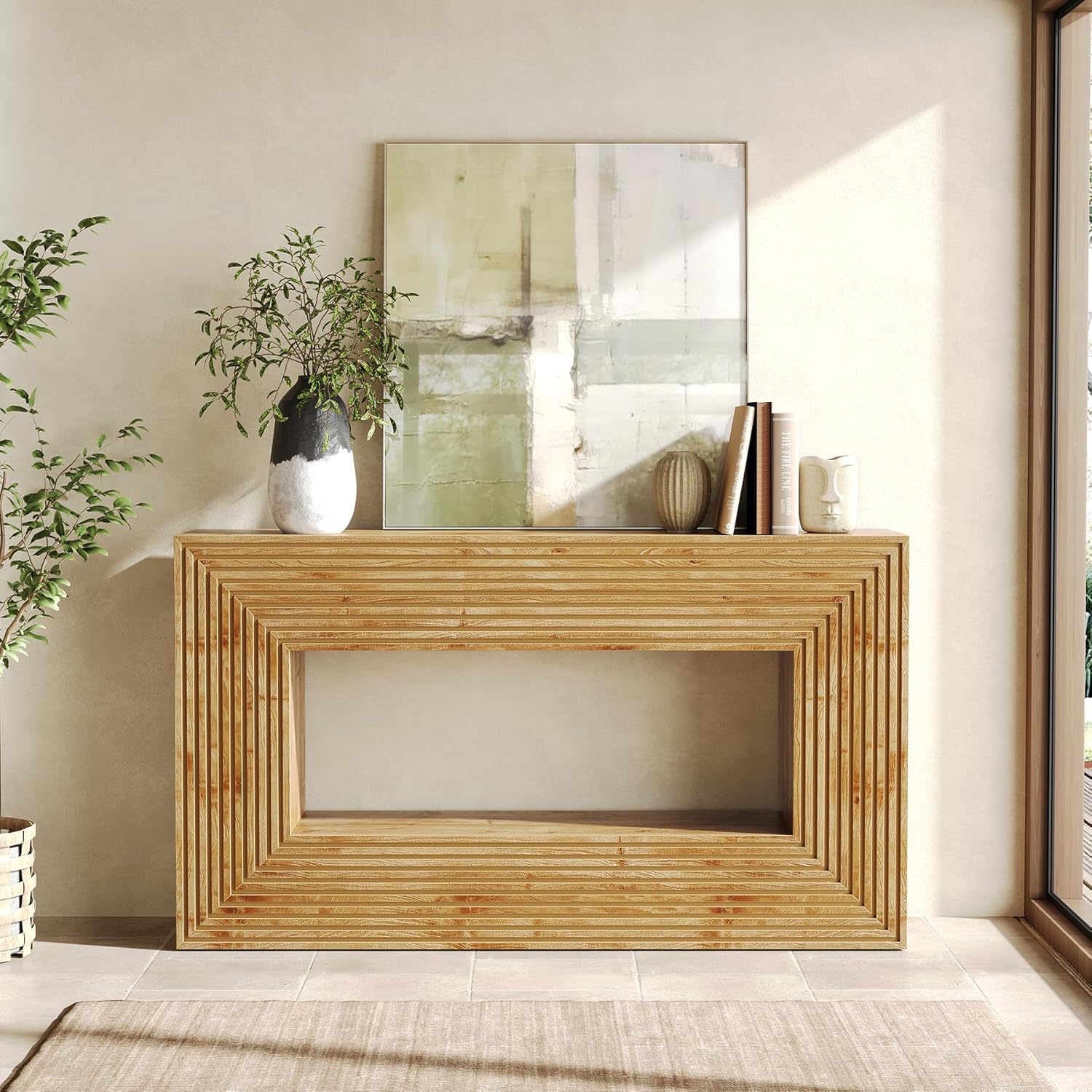 - Farmhouse-Chic Design: This wooden console table boasts natural wood grain and clean, sleek lines. Its unique grooved front merges modern elegance with rustic charm, elevating entryways, living rooms, or hallways with understated sophistication