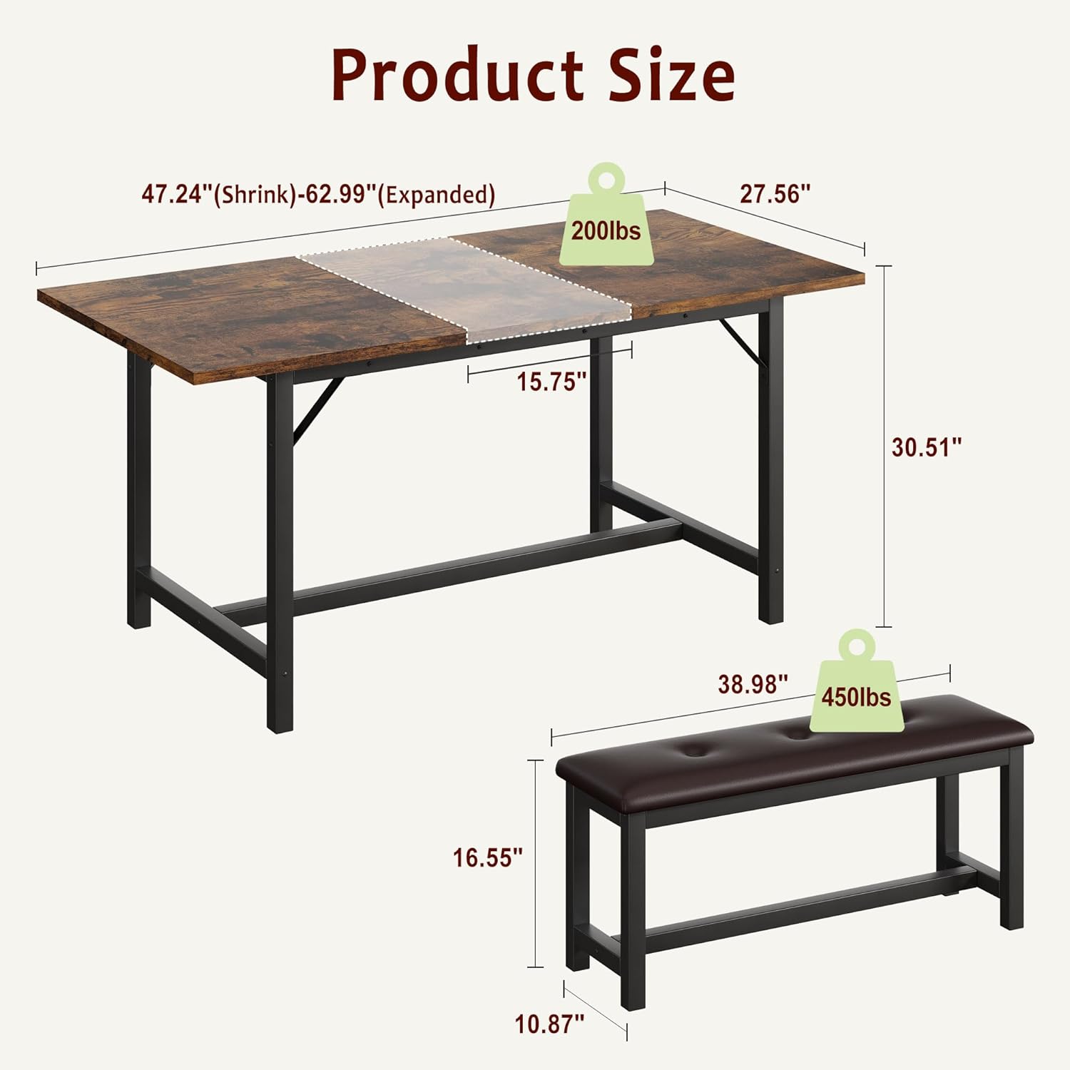Dining Table Set for 4-6, 63“ Large Extendable Kitchen Table Set, Wood Rectangle Kitchen Table with 2 Soft Benches for Small Space, Apartment, Dinner,Saving Space, Retro Brown
