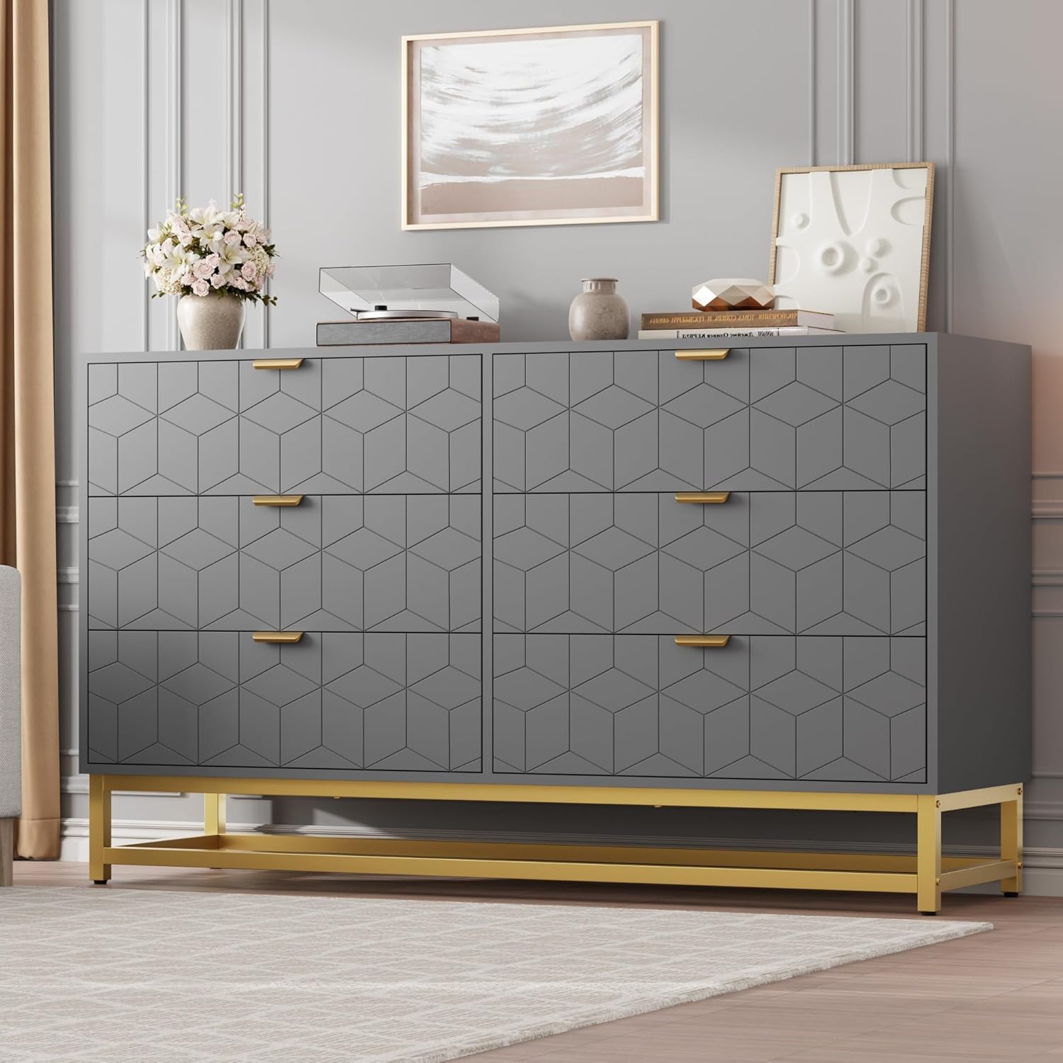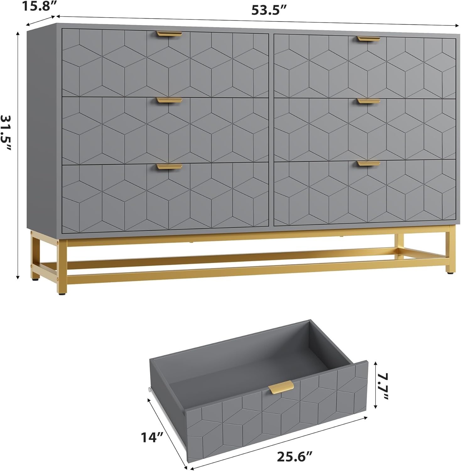 Dresser for Bedroom, 53.5" Large Dresser Organizer, 6 Drawer with Golden Metal Handle and Legs, Modern Chest of Drawers, Grey Dressers with Drawers for Closet, Hallway, Living Room, Entryway
