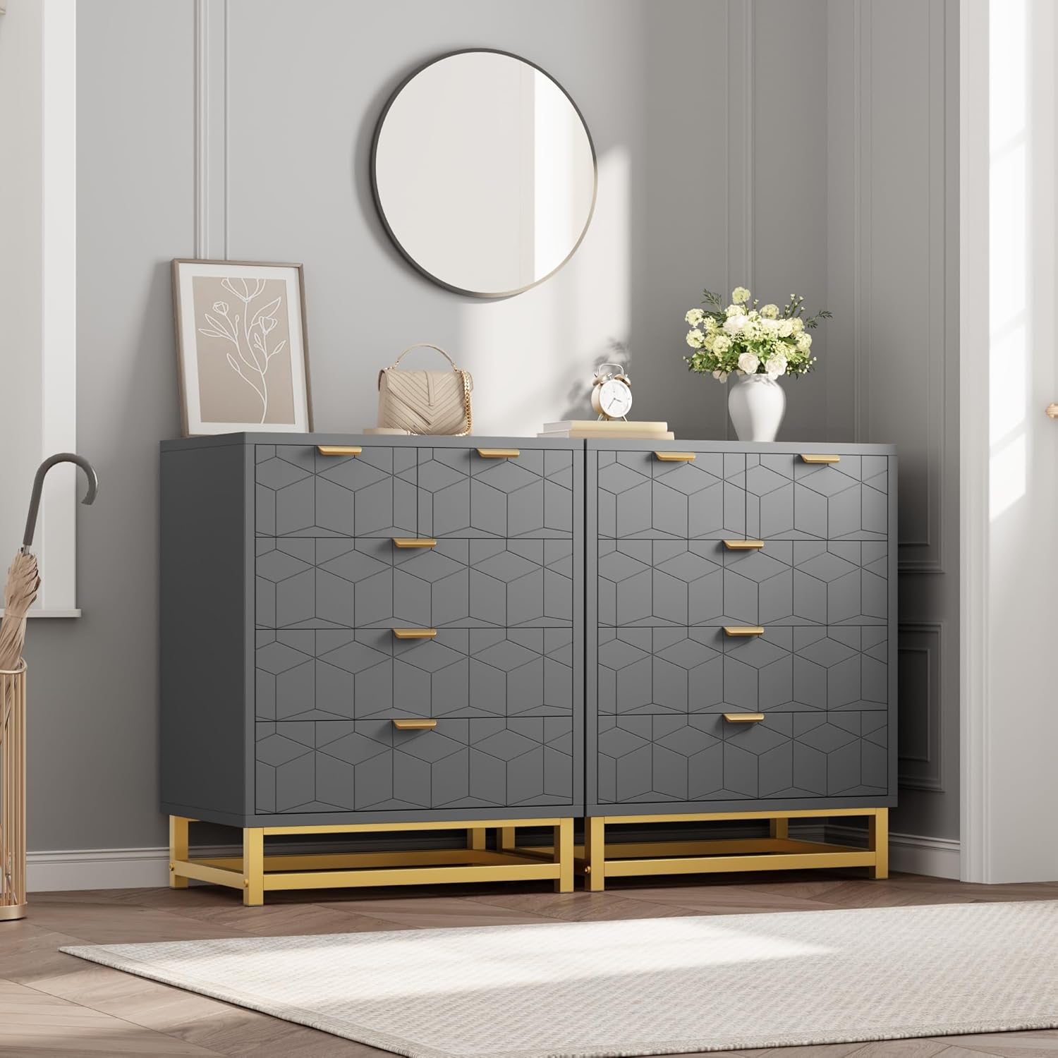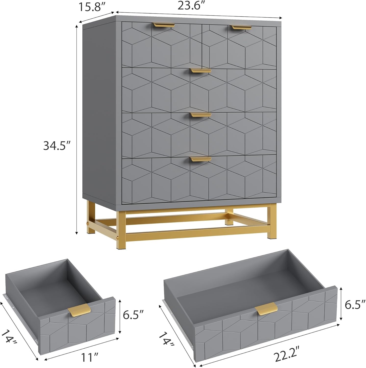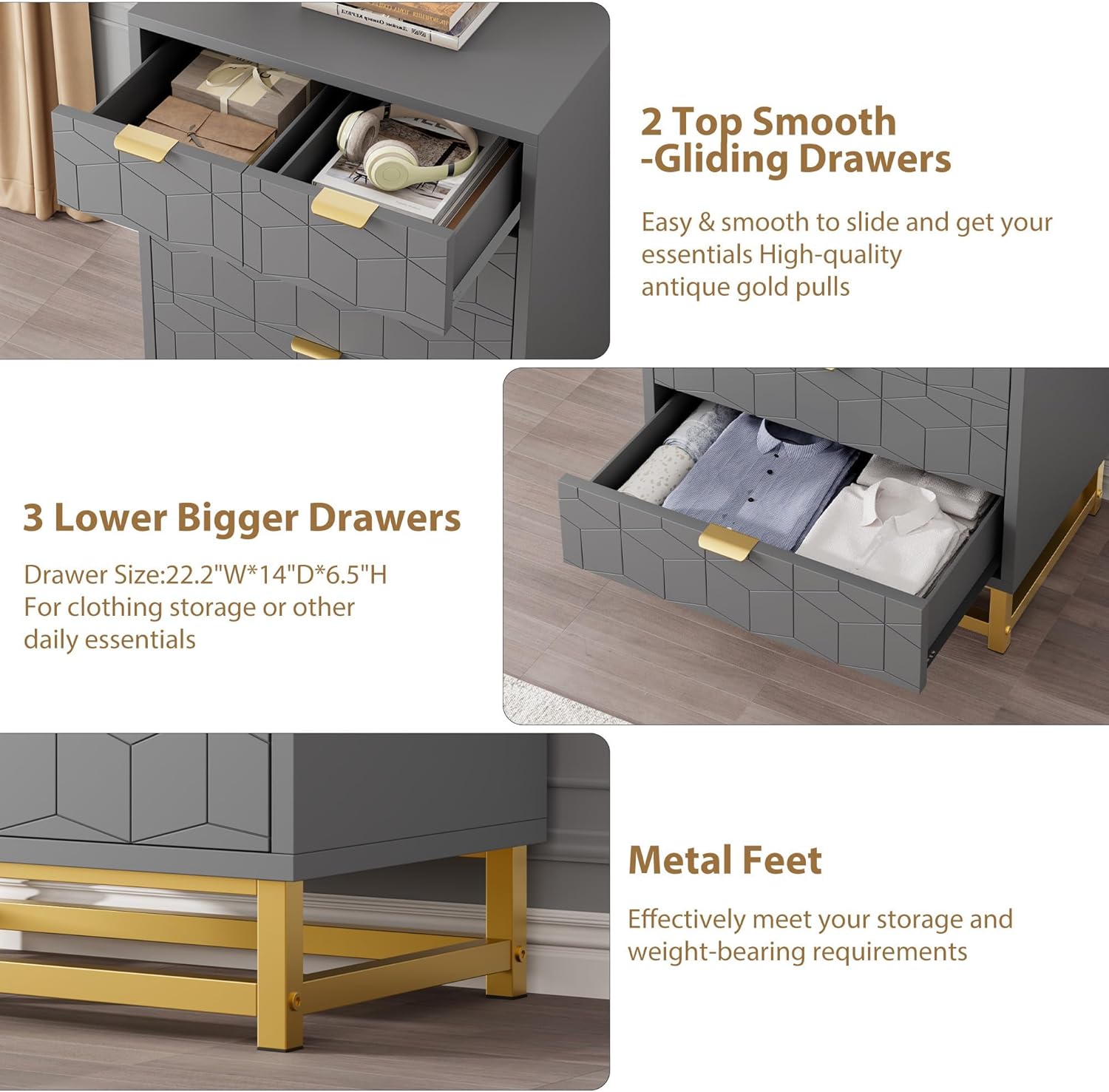 - Elegant & Stylish: Delicate gold metal legs and handles combined with modern engraving patterns add appealing detail to this drawer dresser, and easily match any decoration style to add unique charm to your space.