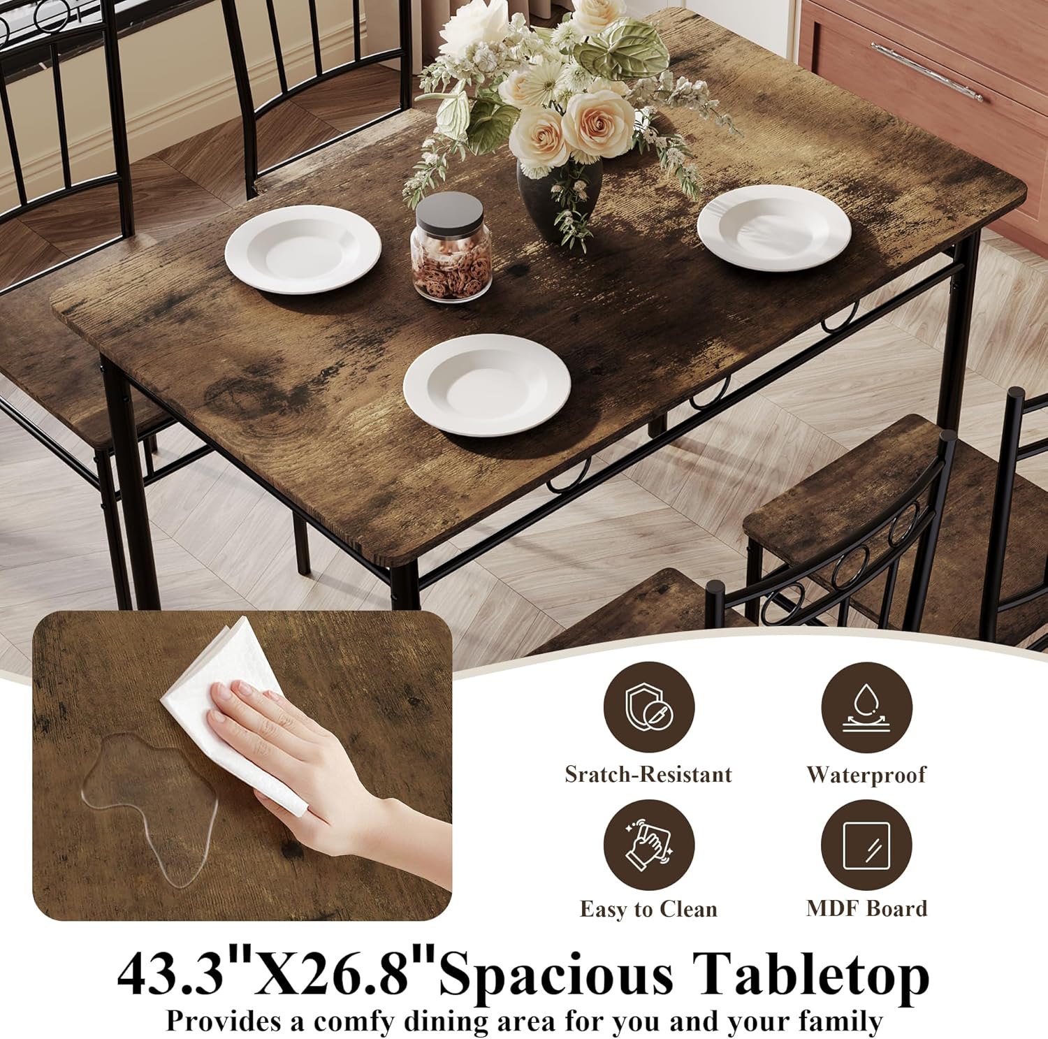 - 【20-Min Setup, Easy Care】No tools? No problem! This dining set arrives with clear, step-by-step instructions for quick 20-minute assembly. The scratch-resistant metal legs and stain-proof wood surfaces mean zero fuss—just wipe and go! Spend less time cleaning and more time enjoying your beautiful, hassle-free dining space.