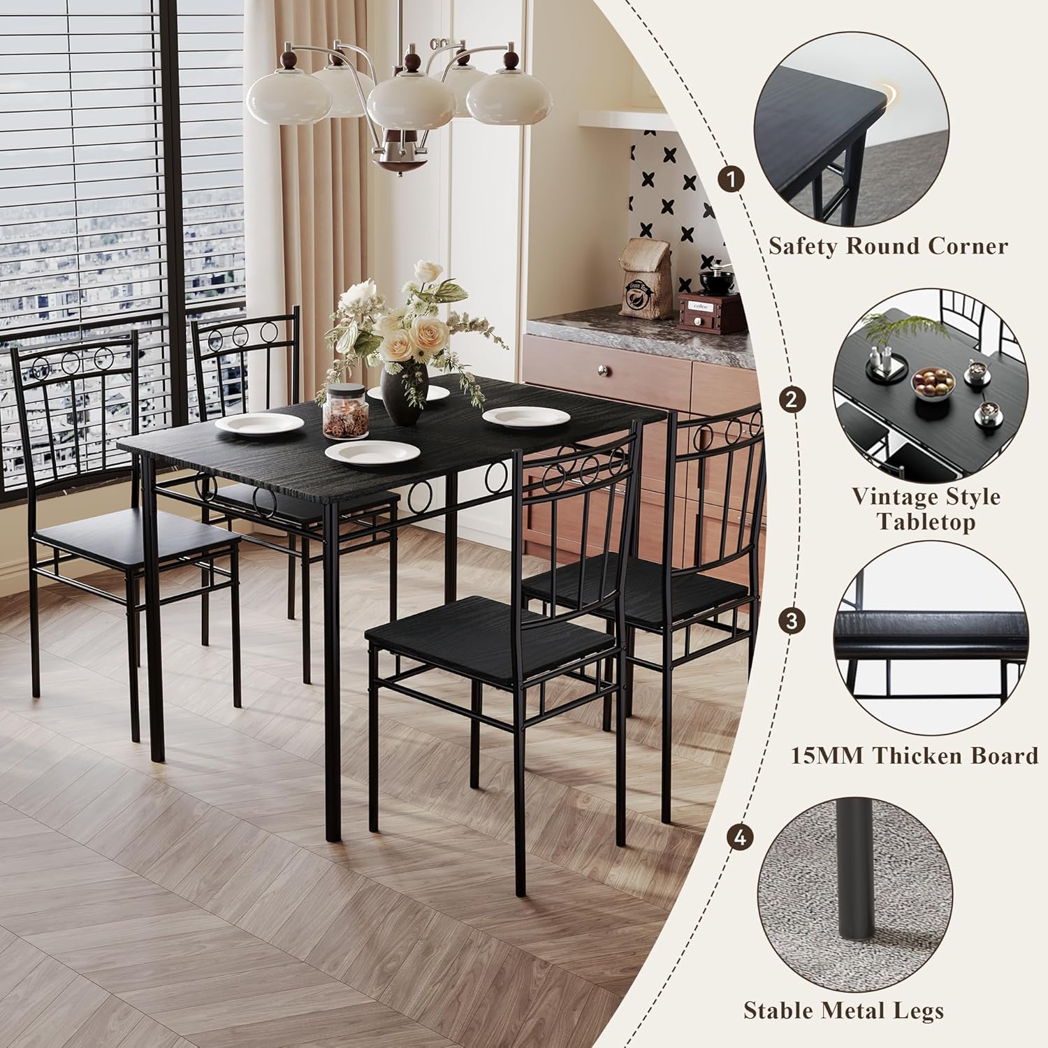 5 Piece Dining Table Set, Modern Metal&Wood Kitchen Dinner Table with 4 Chairs, Dining Room Table Sets for Small Spaces, Black