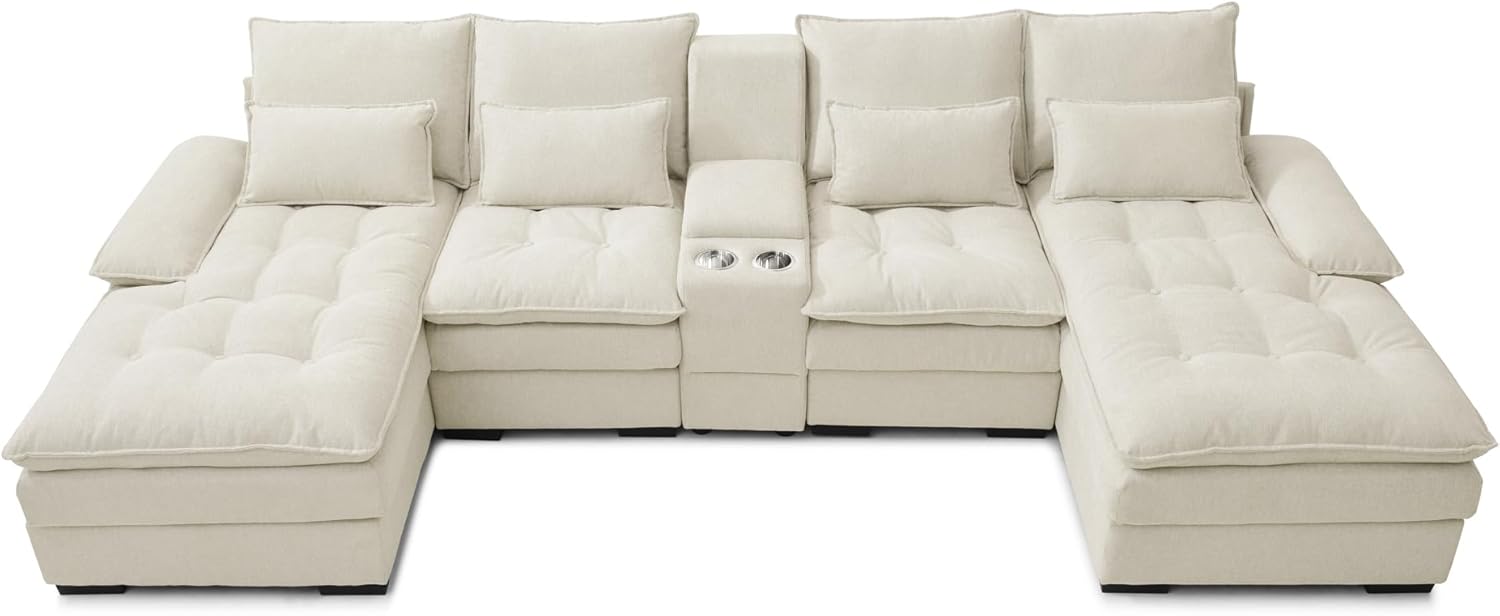 130" U-Shaped Sectional Sofa with Storage Console & Cup Holders, Upholstered 6 Seat Living Room Sleeper Couch Furniture Set w/Chaise, Cloud Cushion Couch for Home, Office, Apartment,Beige
