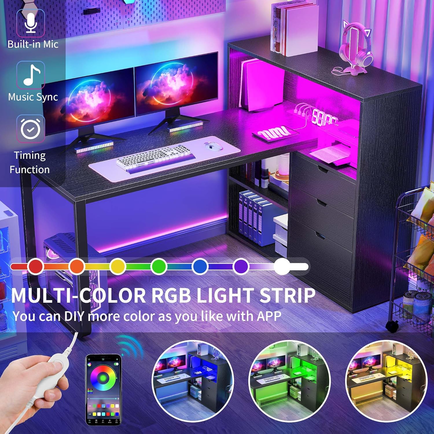 - Smart LED Light Strips: Our L-shaped desk features a beautiful RGB LED light strip, flexibly controlled by a phone app or light strip switch, and you can customize any color you like via app. Plus, choose from various modes including music sync and timer functions to enhance the mood and inspire creativity while working