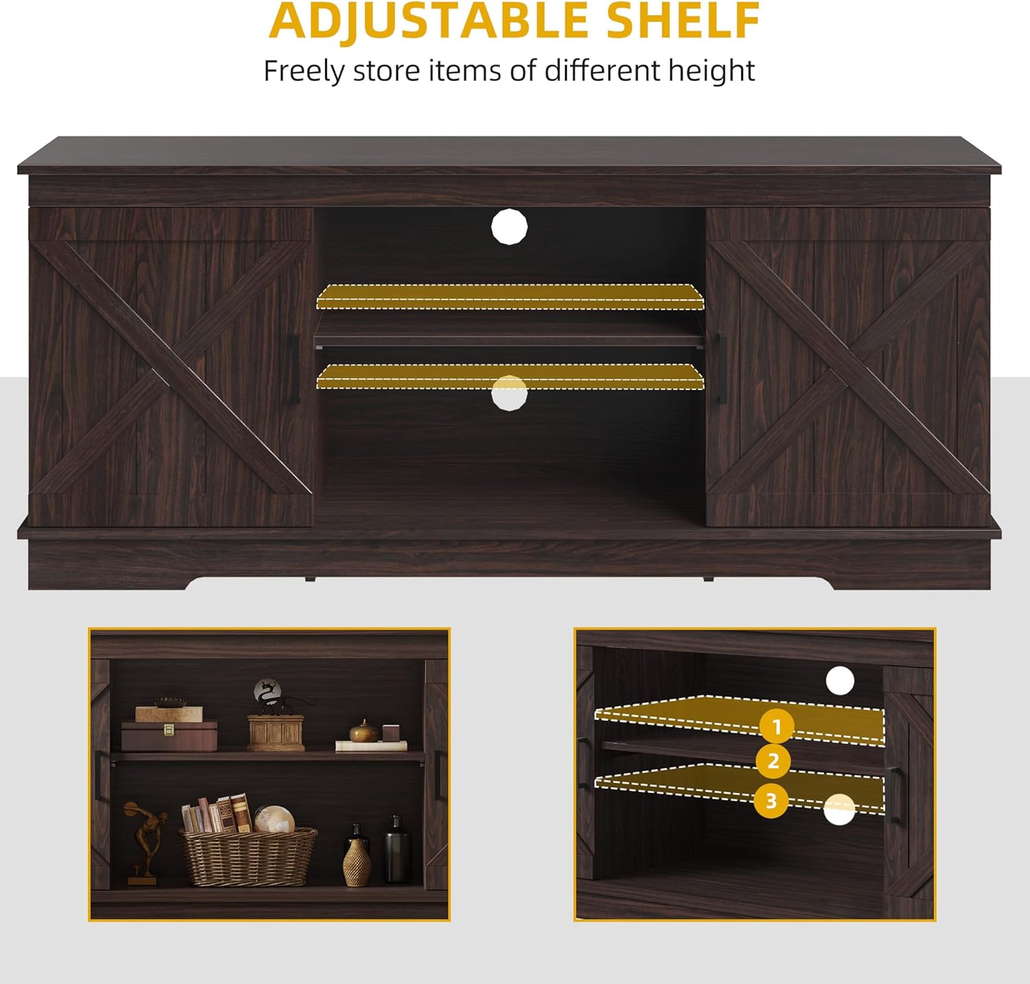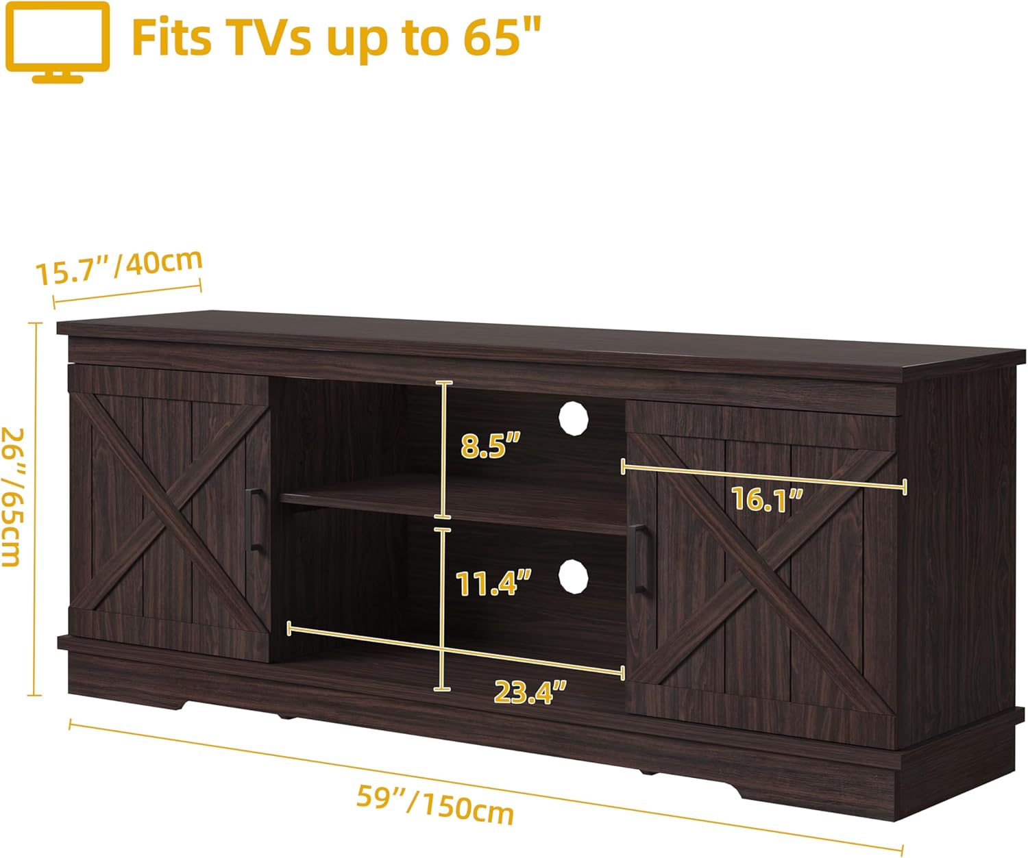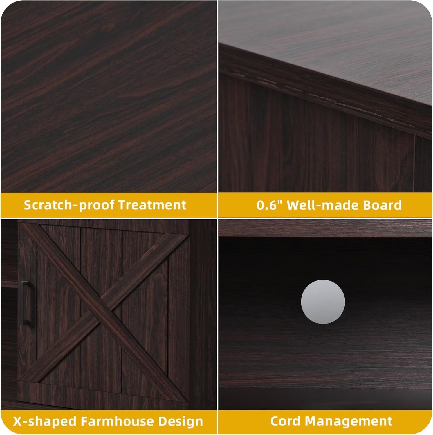 - Farmhouse TV Stand: With double barn doors featuring X elements and a chic blend of elegant grey white & espresso, the DWVO TV console embodies farmhouse charm, doubling as both a decorative piece and a practical storage cabinet