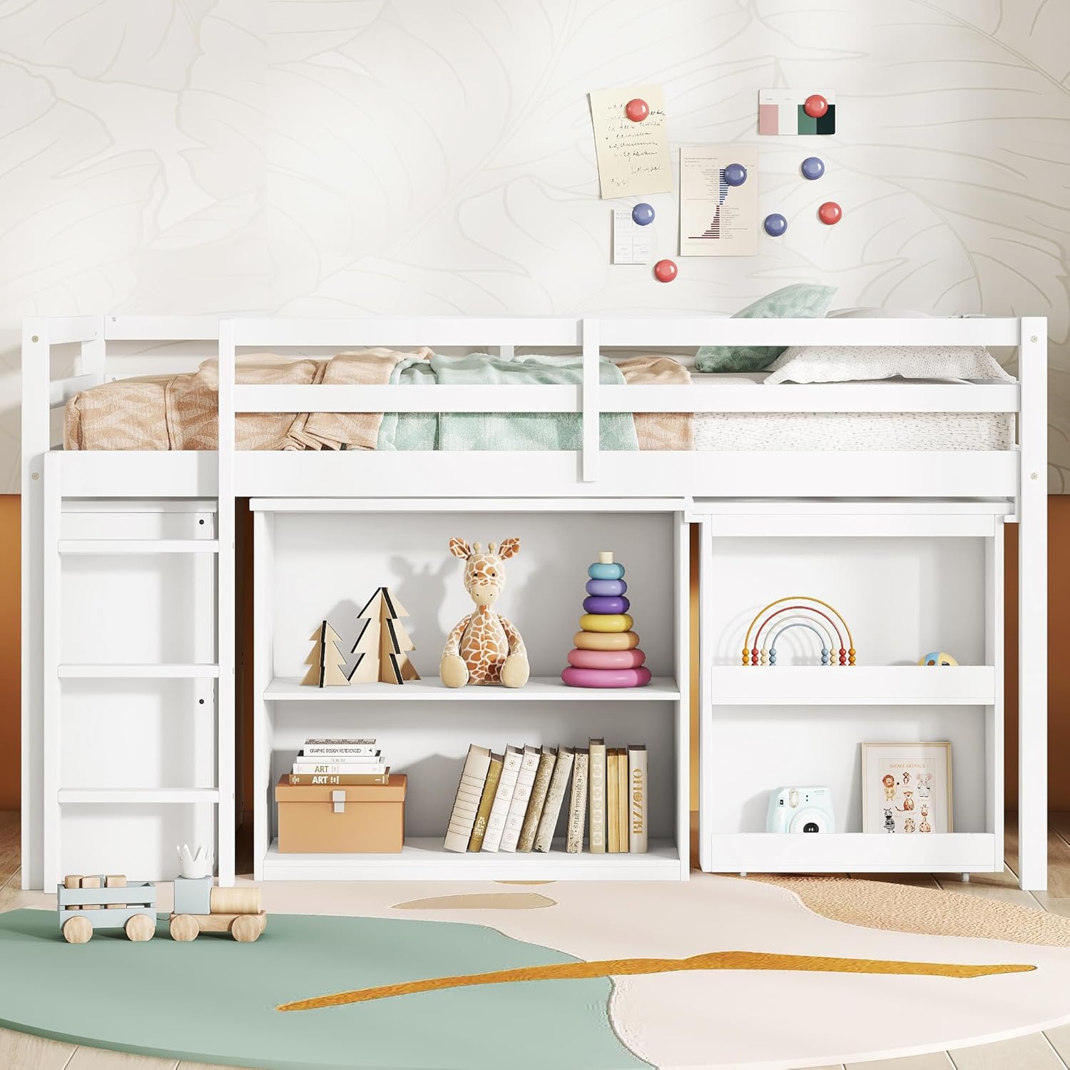 KEIKI Twin Loft Bed with Pull-Out Desk, Drawers & Open Shelves, Wooden Bed Frame with Guardrail, Low Design for Kids, White