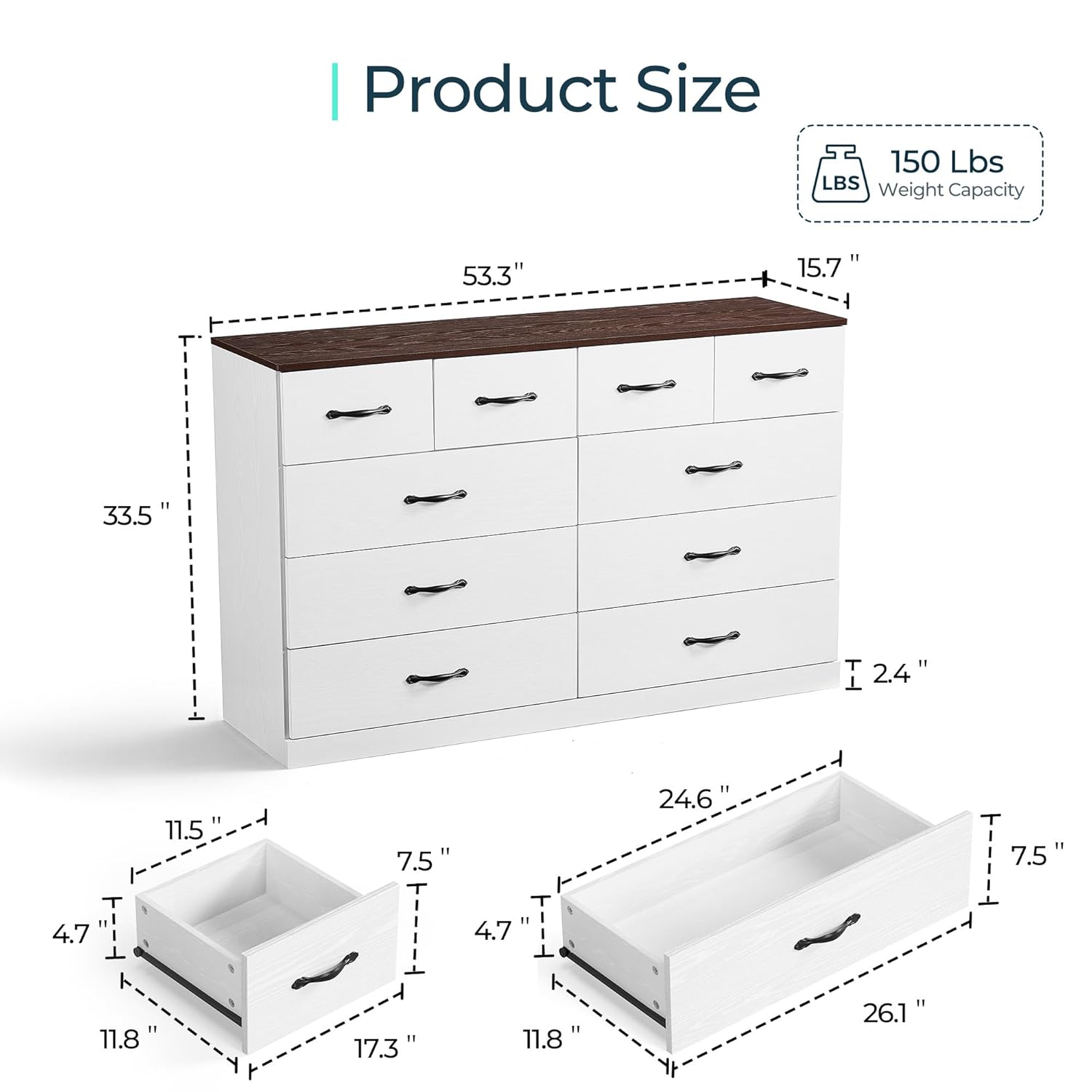 LINSY HOME 10 Drawer Dresser for Bedroom, 54" Wide Chest of Drawers, Modern TV Stand Dressers with Wood Frame and Metal Handles, Large Drawer Organizer for Bedroom, Living Room, White