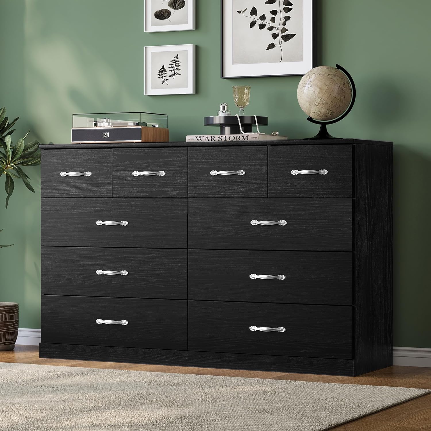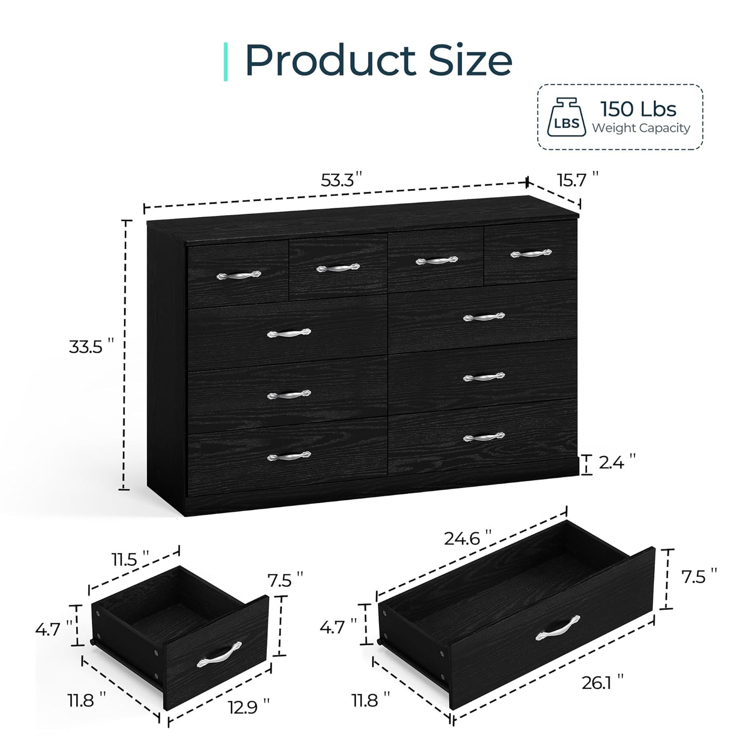 LINSY HOME 10 Drawer Dresser for Bedroom, 54" Wide Chest of Drawers, Modern TV Stand Dressers with Wood Frame and Metal Handles, Large Drawer Organizer for Bedroom, Living Room, Black