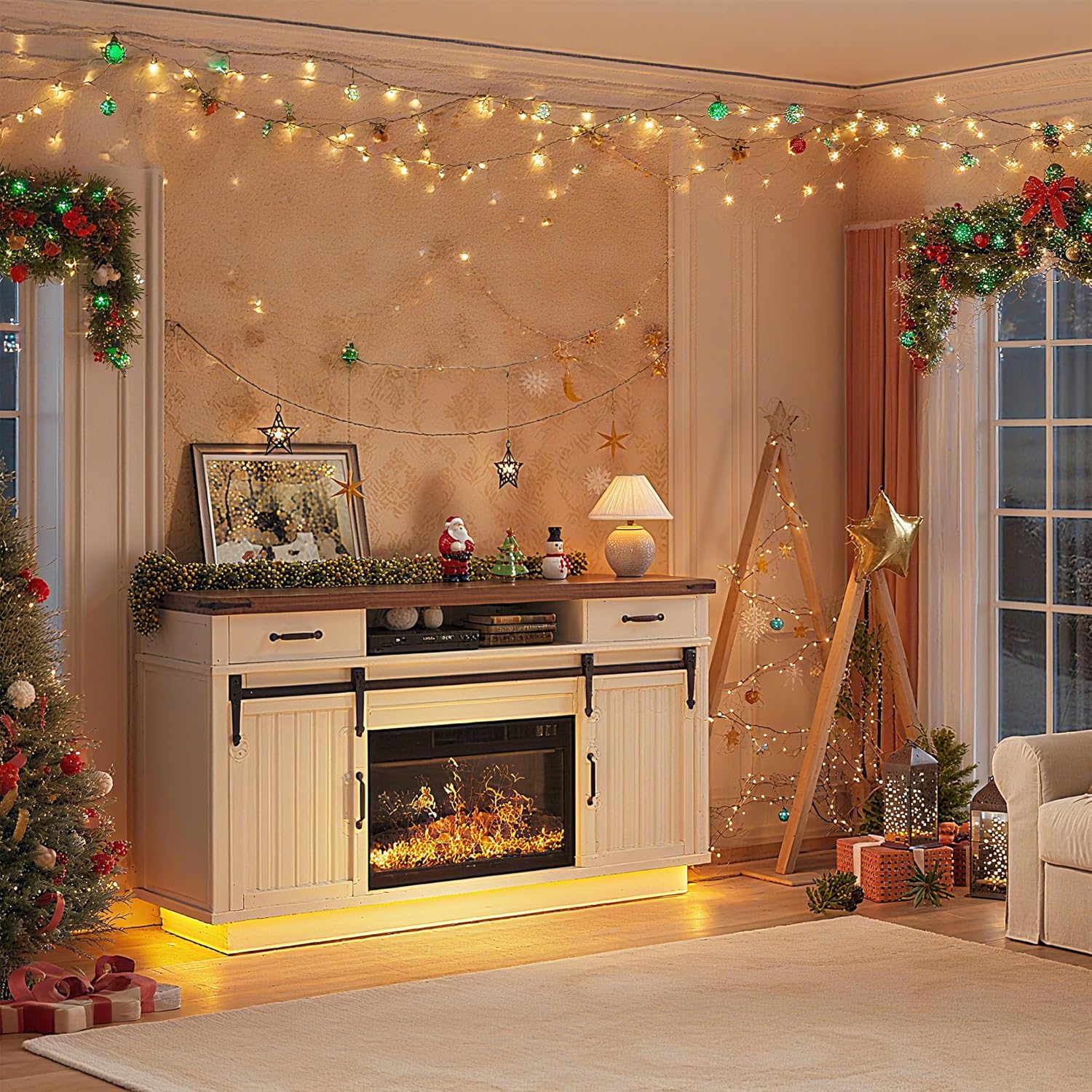 59'' Fireplace TV Stand with 3D Flame Electric Fireplace Heater, 34'' Tall Farmhouse TV Stand for 65 Inch TV, Entertainment Center TV Console with 2 Drawers, Sliding Barn Door for Living Room - White