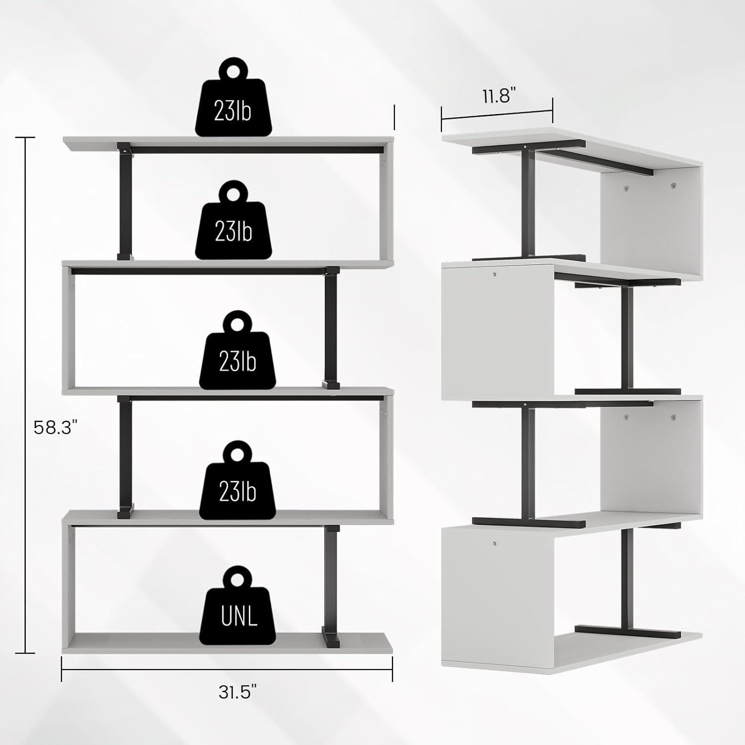 - MORDEN S SHAPED DESIGN: This S-shaped bookshelf features a modern and unique design that fits into various spaces, including your living room, study, office, or storage room. Its sleek structure adds a contemporary touch while maximizing functionality
