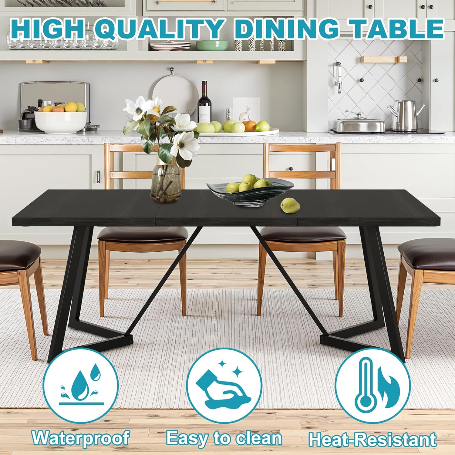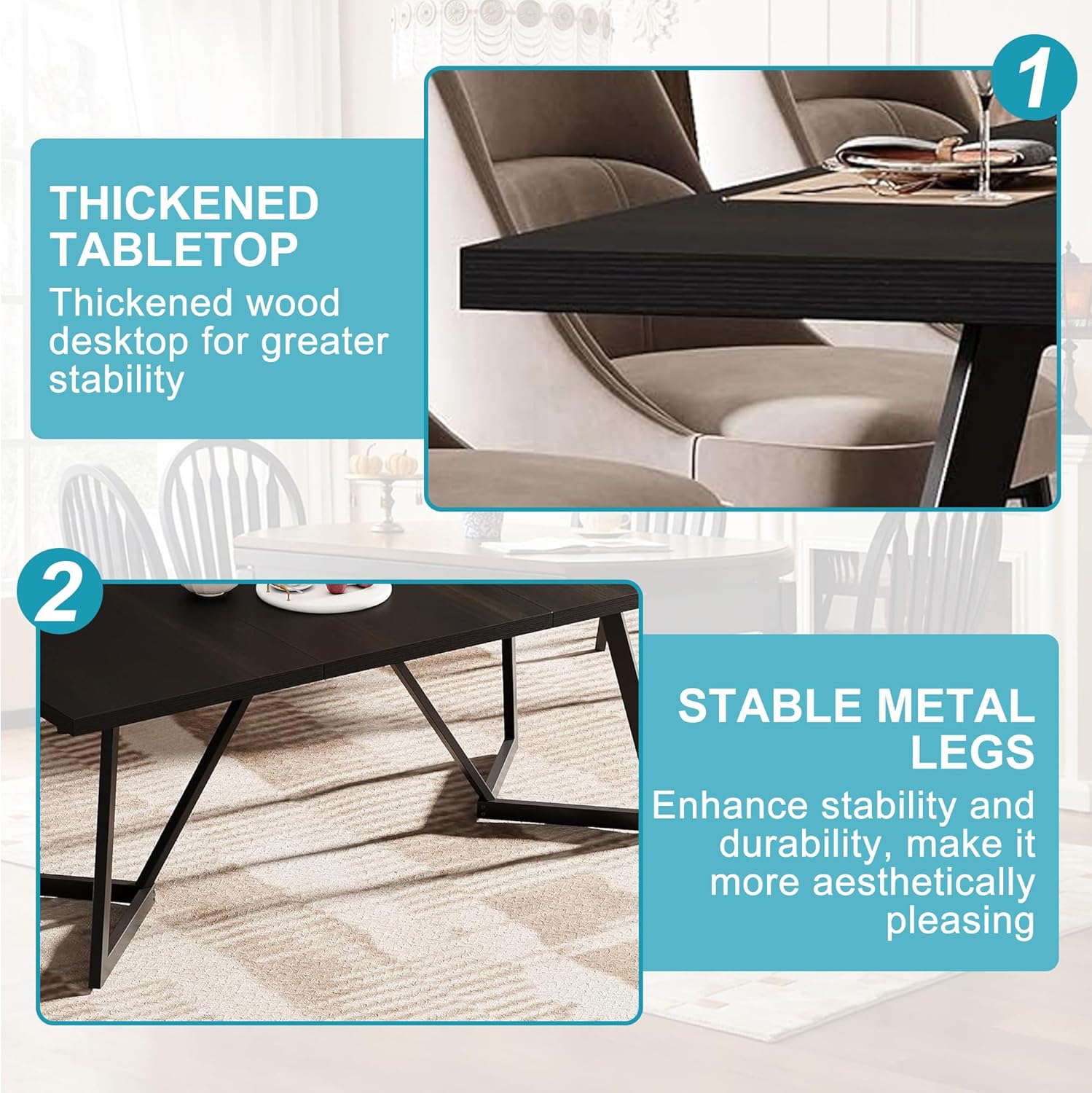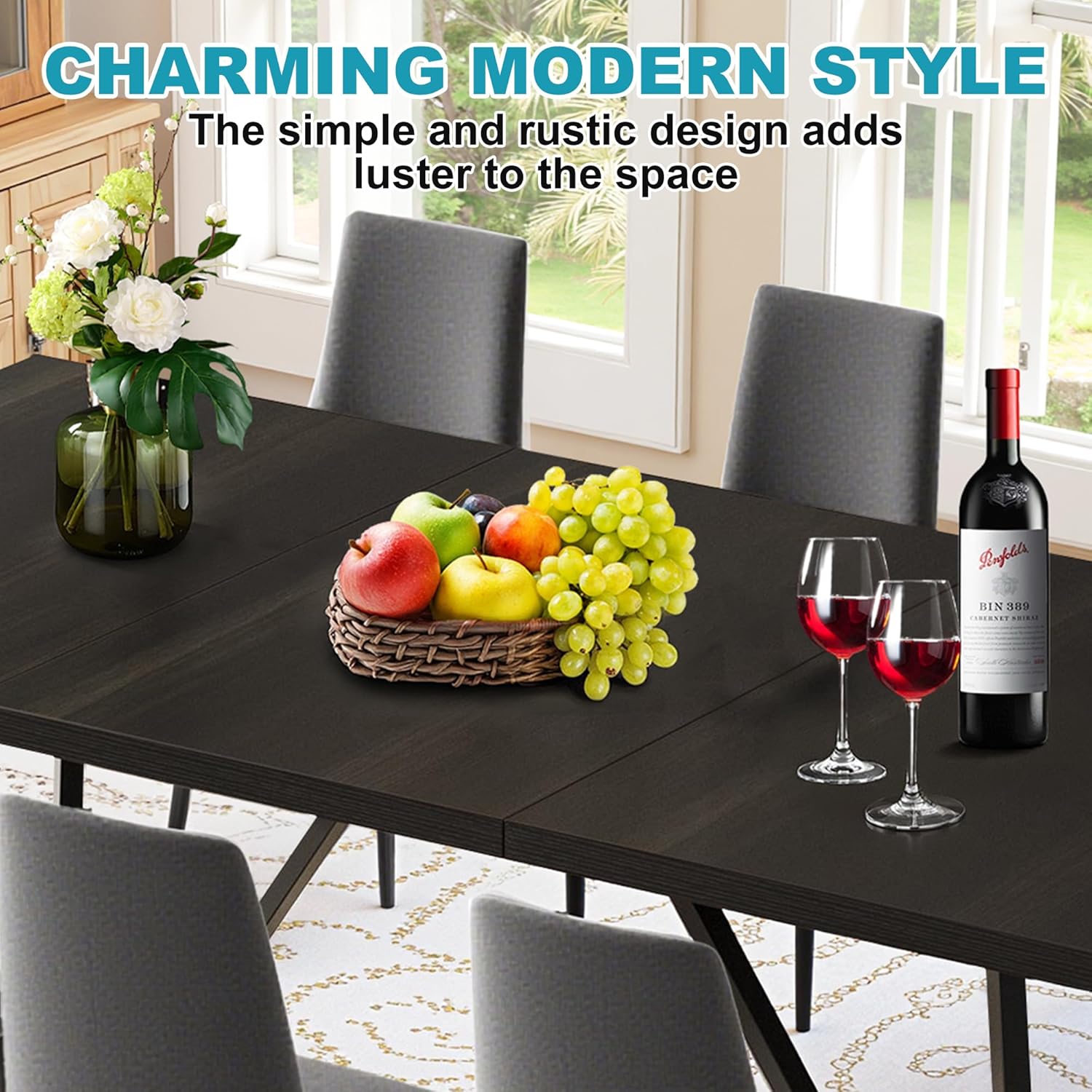 - Modern and Stylish: This farmhouse dining room table features a modern, minimalist design. The tabletop features a rich black wood grain and is framed by black metal legs, creating a sophisticated look. The simple black exterior blends effortlessly into any decor.
