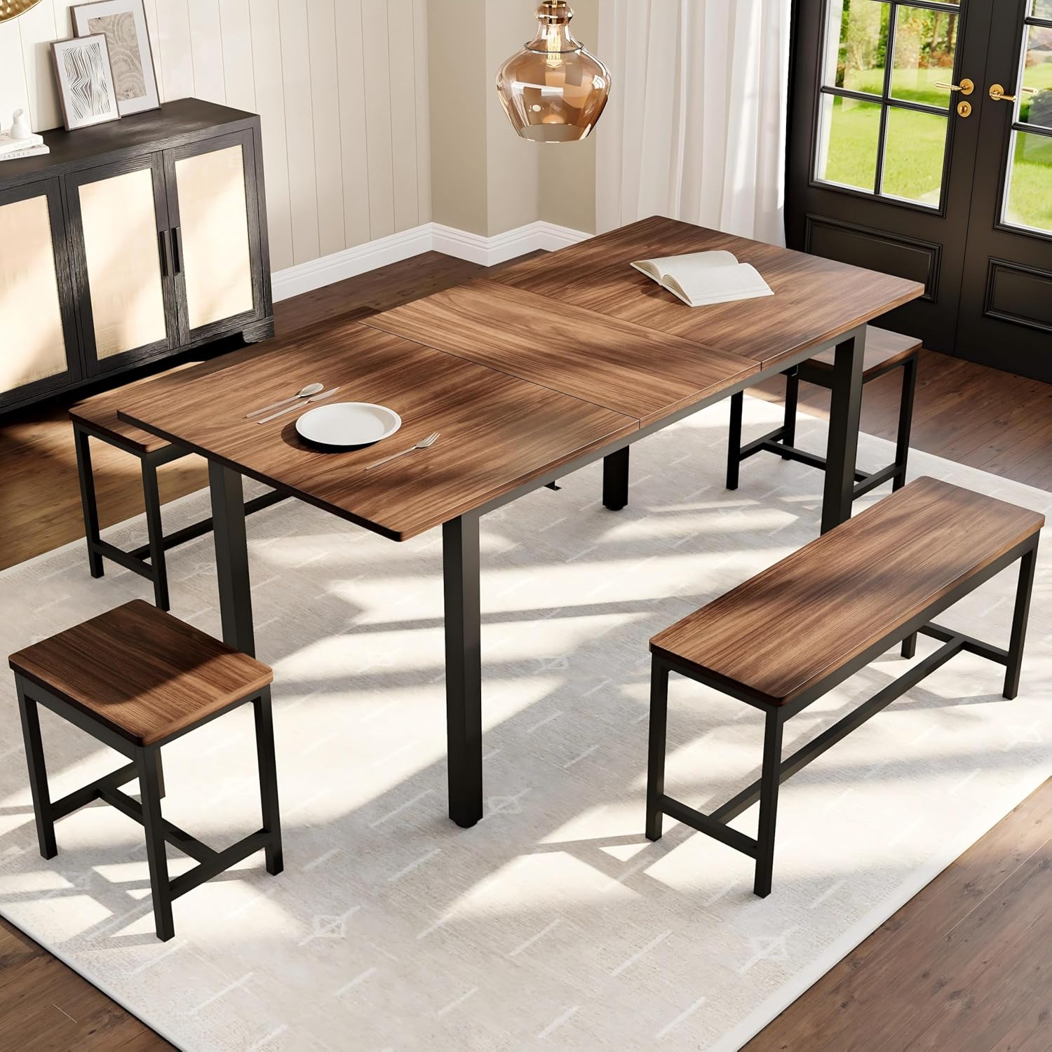 IDEALHOUSE 5-Piece Extendable Dining Table Set for 4-8 People, 63 Inch Kitchen Table with 2 Benches & 2 Stools, Space Saving Modern Dining Room Furniture, Easy Assembly, Brown