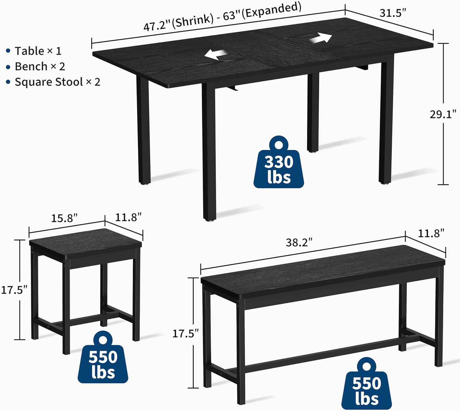 IDEALHOUSE 5-Piece Extendable Dining Table Set for 4-8 People, 63 Inch Kitchen Table with 2 Benches & 2 Stools, Space Saving Modern Dining Room Furniture, Easy Assembly, Black