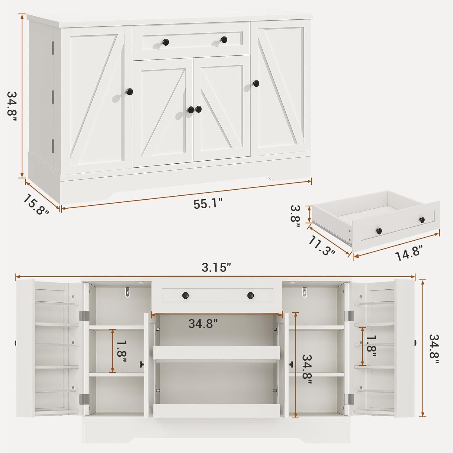 55" Buffet Cabinet with Storage, Kitchen Buffet Sideboard with Pull-Out Shelves and Drawer, Wood Farmhouse Coffee Bar Cabinet with 4 Adjustable Shelves, Kitchen Pantry for Living Room, White