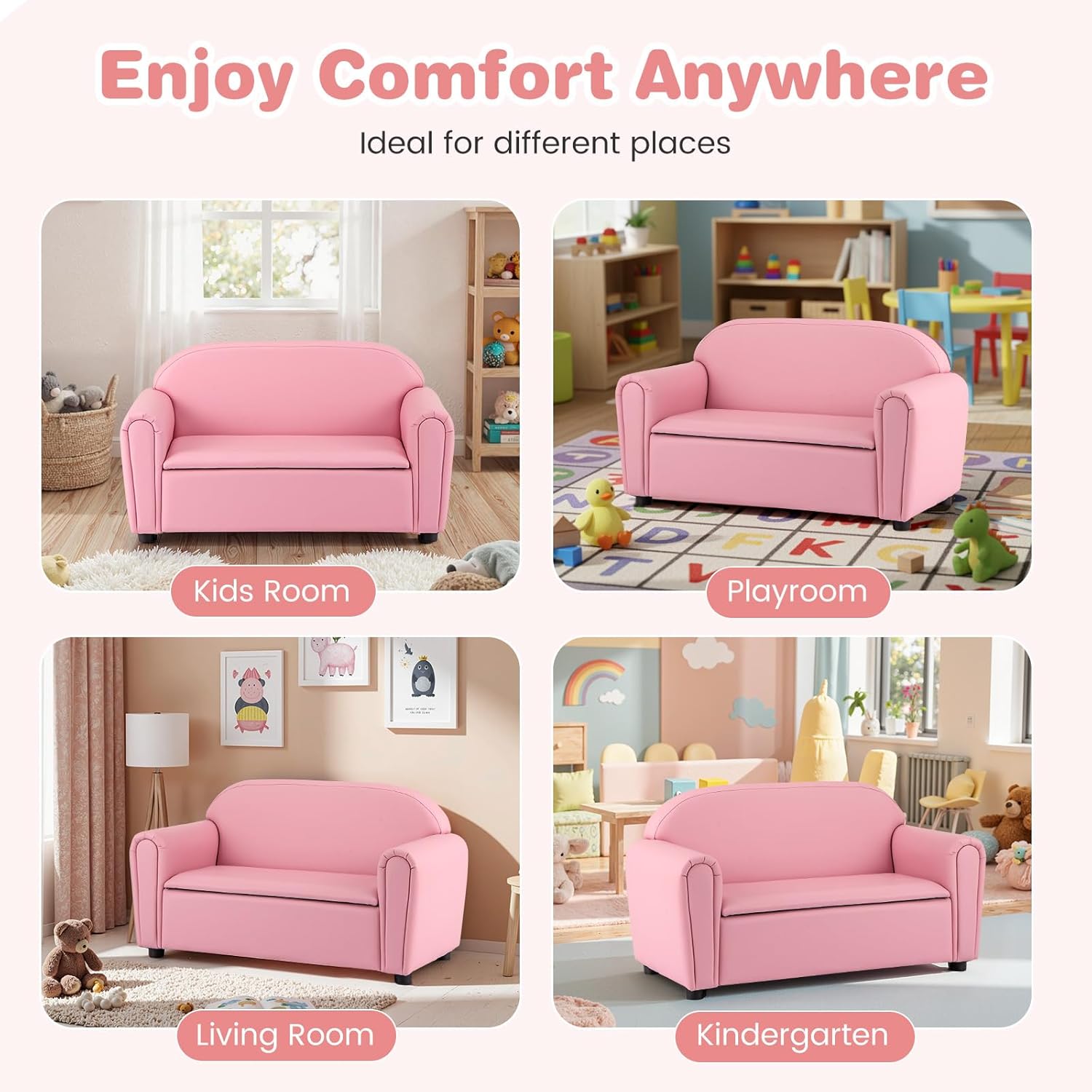 Costzon Kids Couch, 2 in 1 Double Seat Children's Sofa w/Under Seat Storage, PU Leather Surface, Toddler Armrest Chair, Kids Room, Soft Children Pink Sofa with Storage for Preschool Baby Girls Gifts
