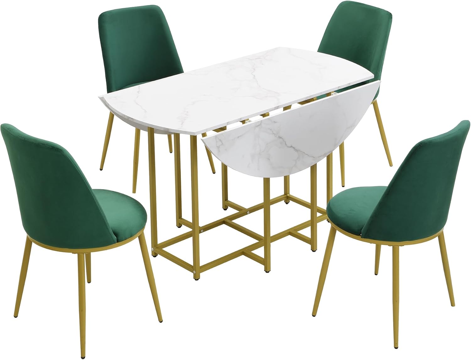 Merax 47.2” Round Dining Table Set for 4, Foldable Kitchen Dining Table with 11.8” Drop Leaves, Faux Marble Top with Golden Frame, 4 Upholstered Chairs (White+Green)