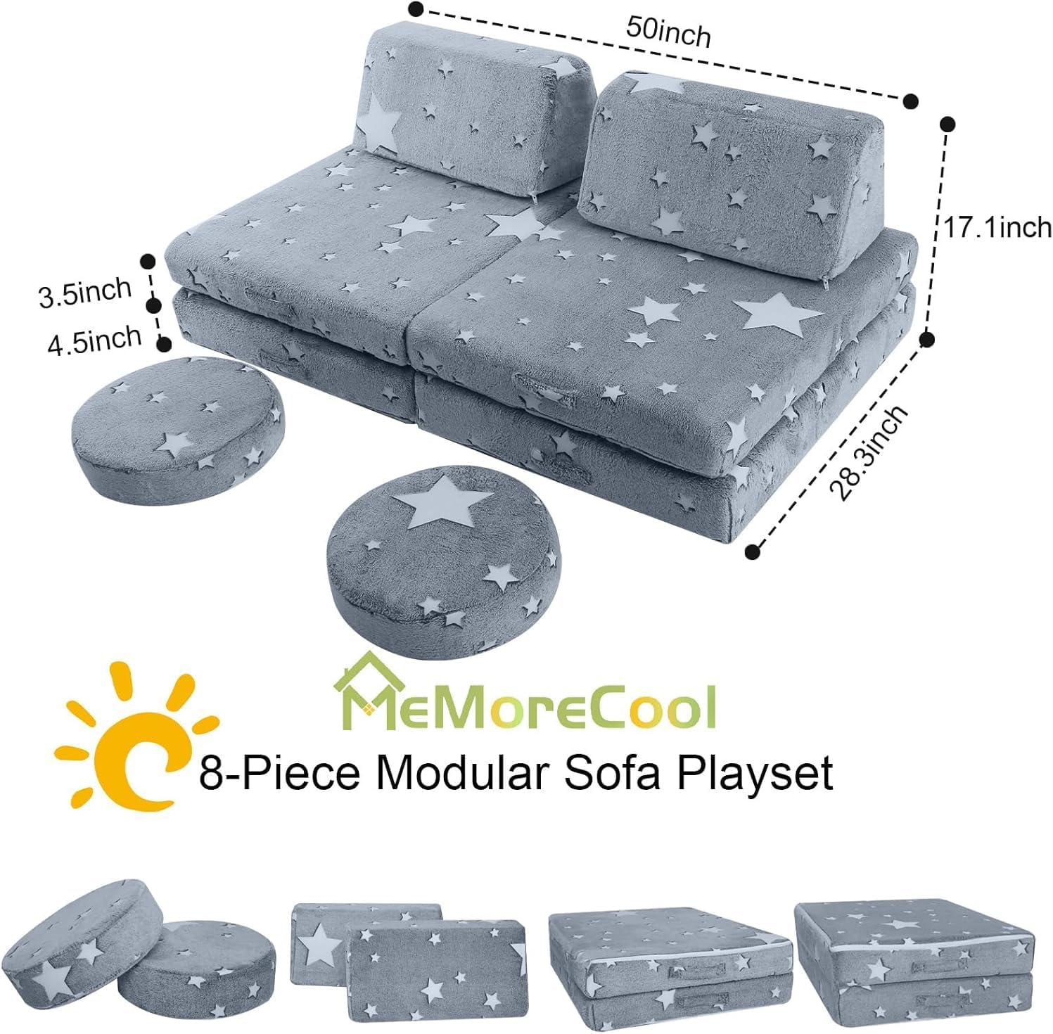 MeMoreCool 8-Piece Kids Modular Play Couch — Glow-in-The-Dark Star Foam Sofa Set for Toddlers, Convertible Fort Building & Climbing Furniture with Washable Covers, Playroom & Indoor Activity Set