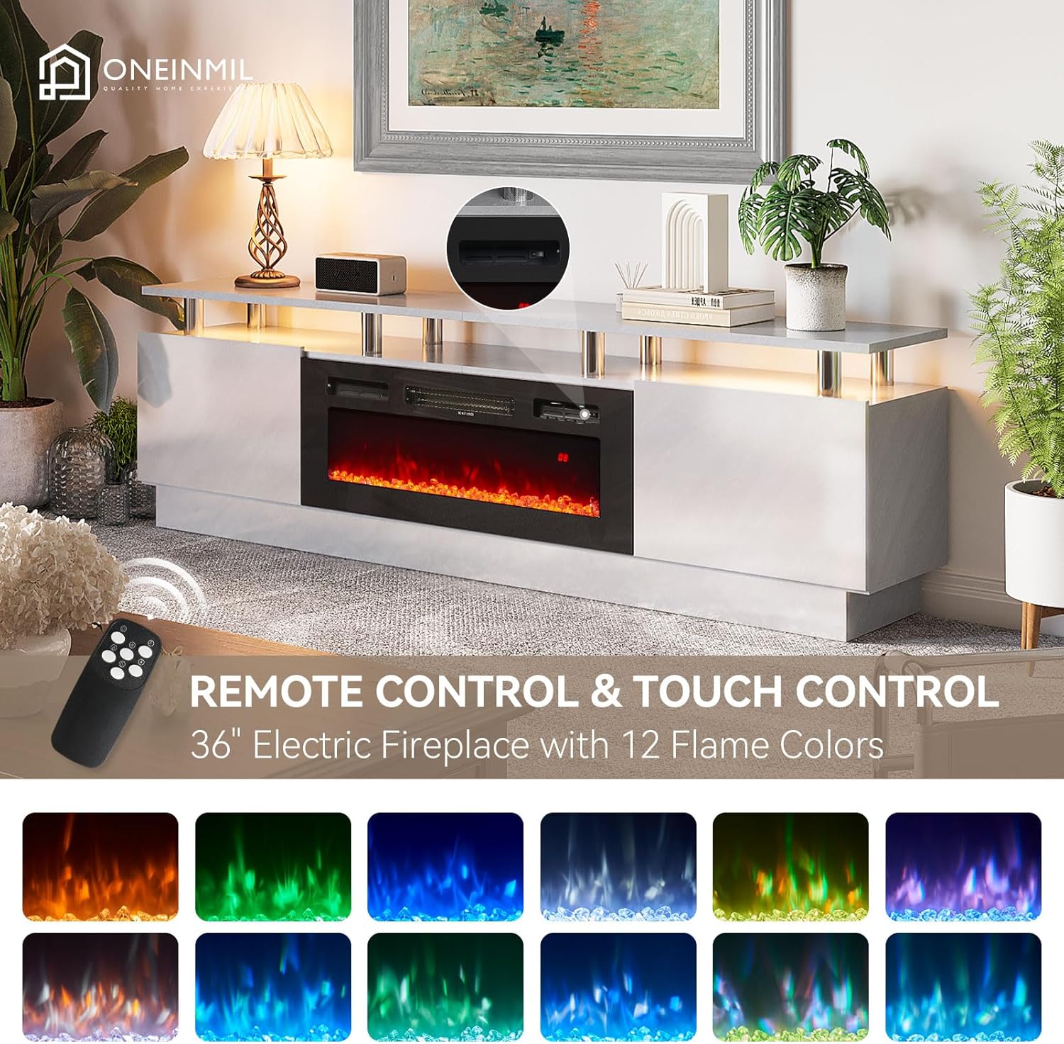 - TV Stand with 36" Fireplace: 80"L stand integrates twelve colors electric fireplace with five dimmer levels & thirty-six colors LED color combos for a customizable viewing & heating experience