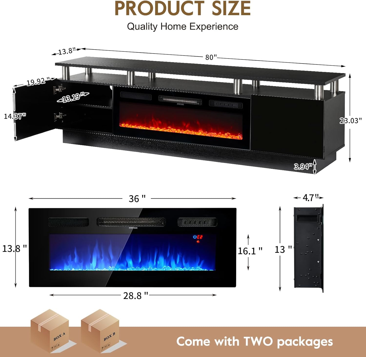 - TV Stand with 36" Fireplace: 80"L stand integrates twelve colors electric fireplace with five dimmer levels & thirty-six colors LED color combos for a customizable viewing & heating experience