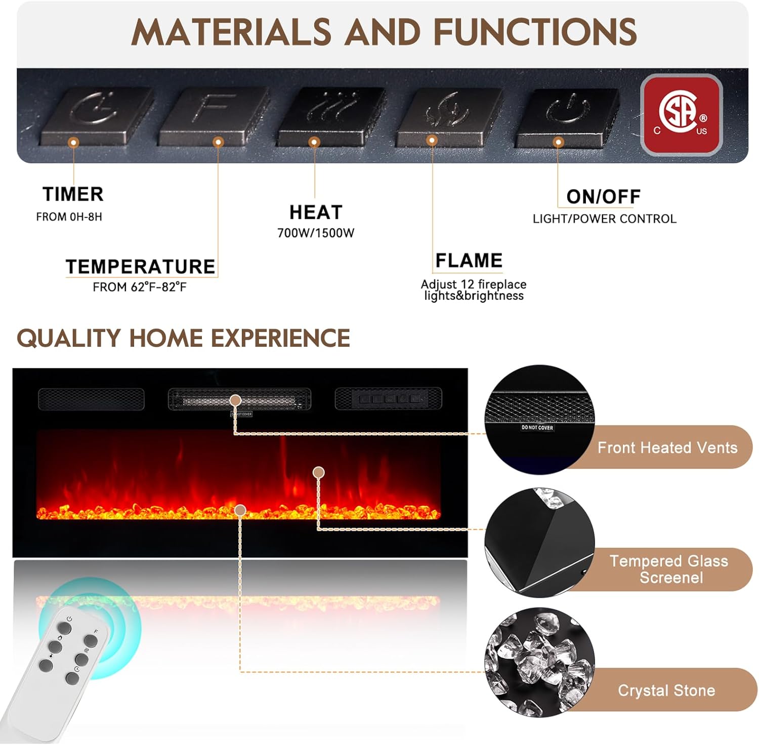 - Safe & Energy-Efficient Fireplace: Adjustable temp range (62-82°F) with overheat protection & auto shut-off timer, CSA&ETL certified