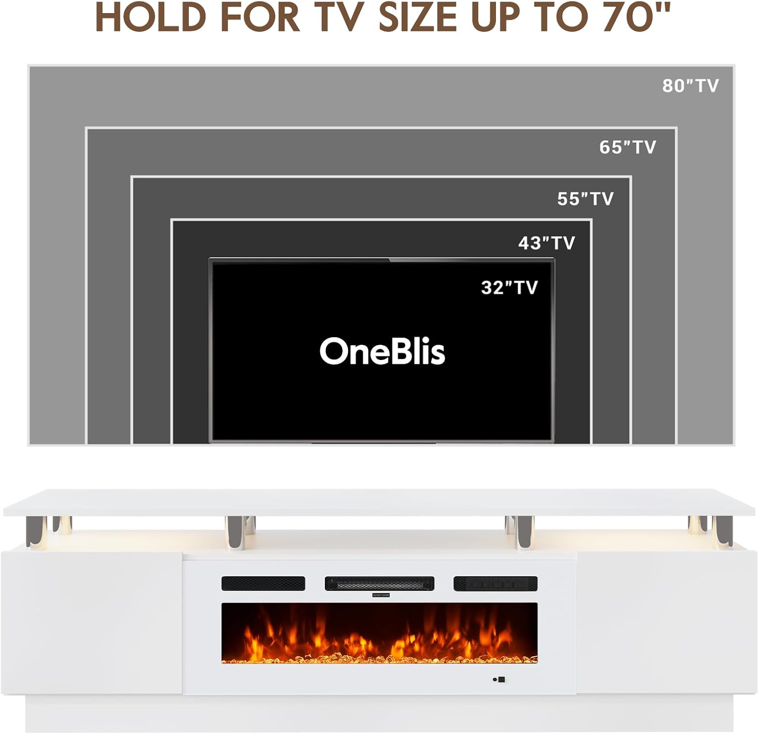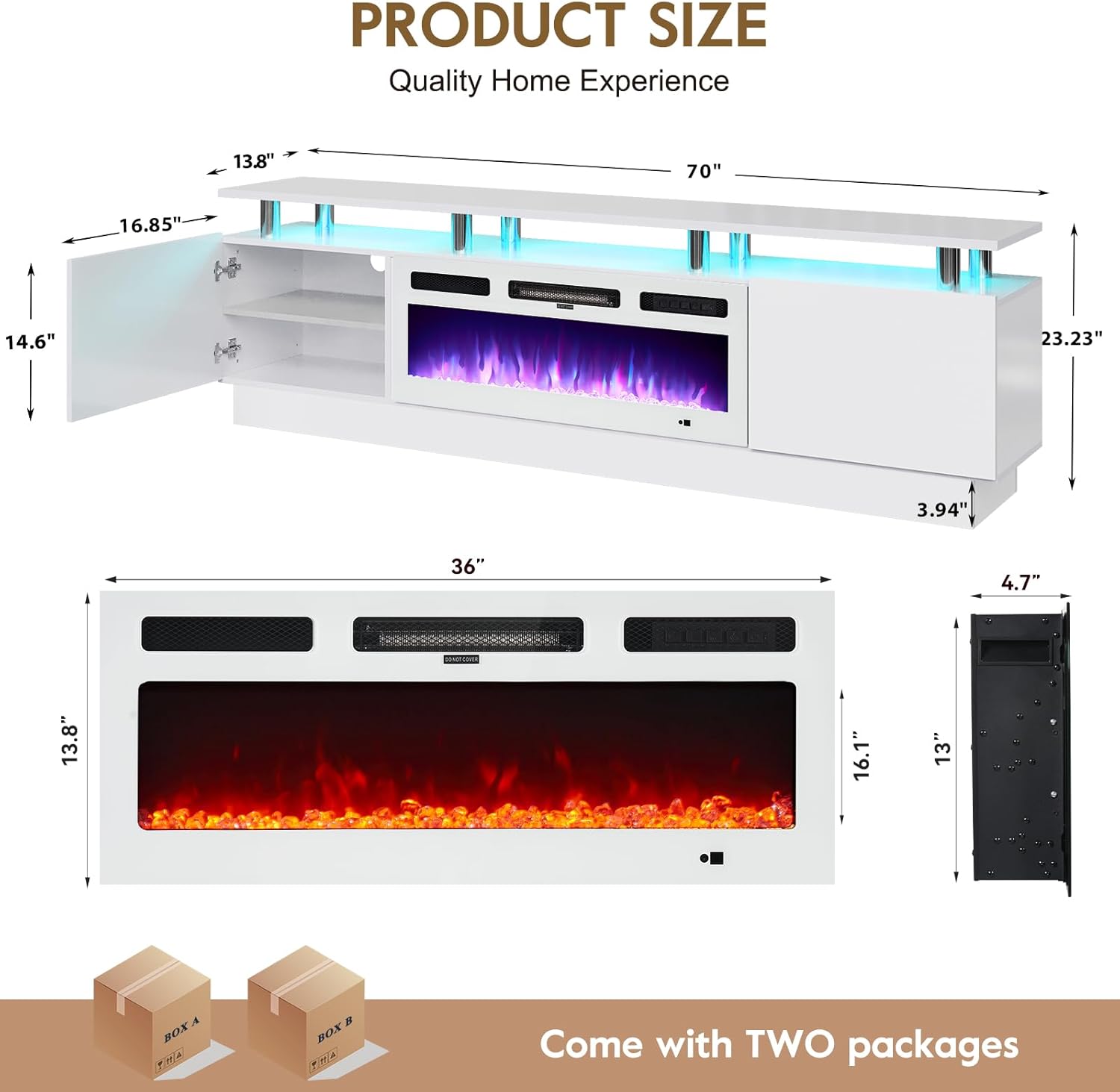 - TV Stand with 36" Fireplace: 70"L stand integrates 12-color electric fireplace with 5 dimmer levels & 36 LED color combos for a customizable viewing & heating experience.