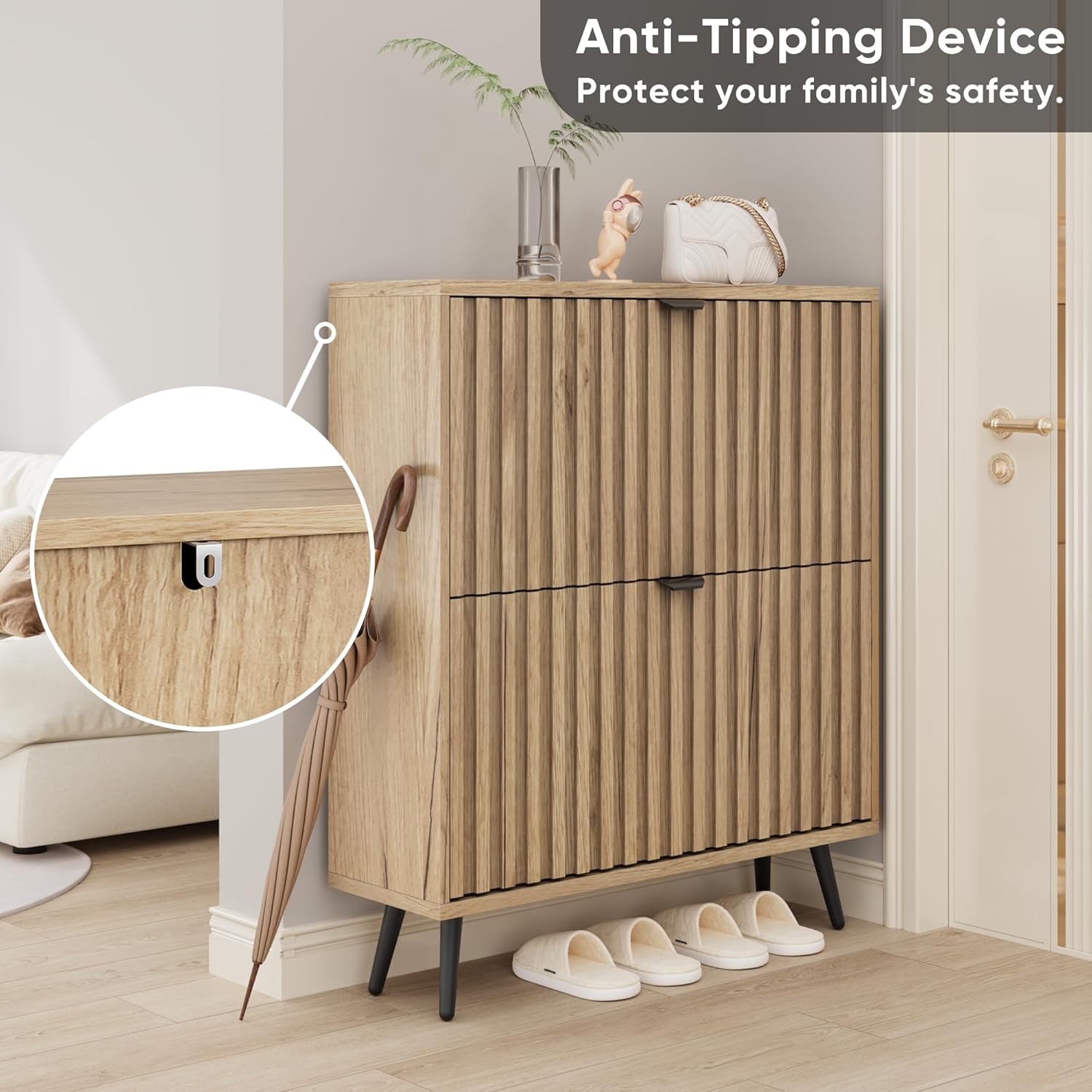 - 【Unique Design】This shoe cabinet features fluted design elements and a special production process that gives the doors with fluted elements an overall seamless look. The combination of natural color and matte metal makes a perfect blend of mid-century and modern. It can be applied to any style.