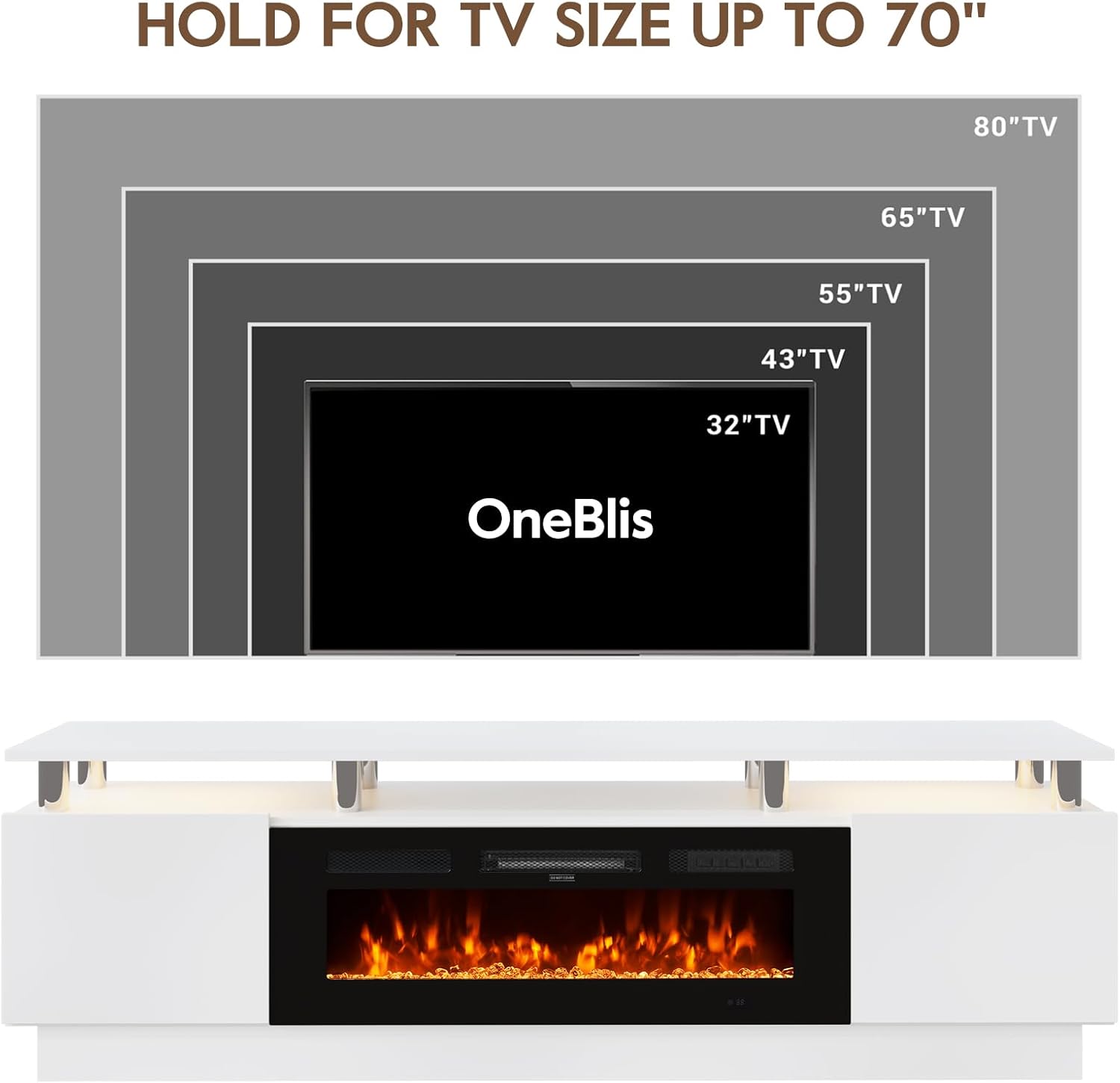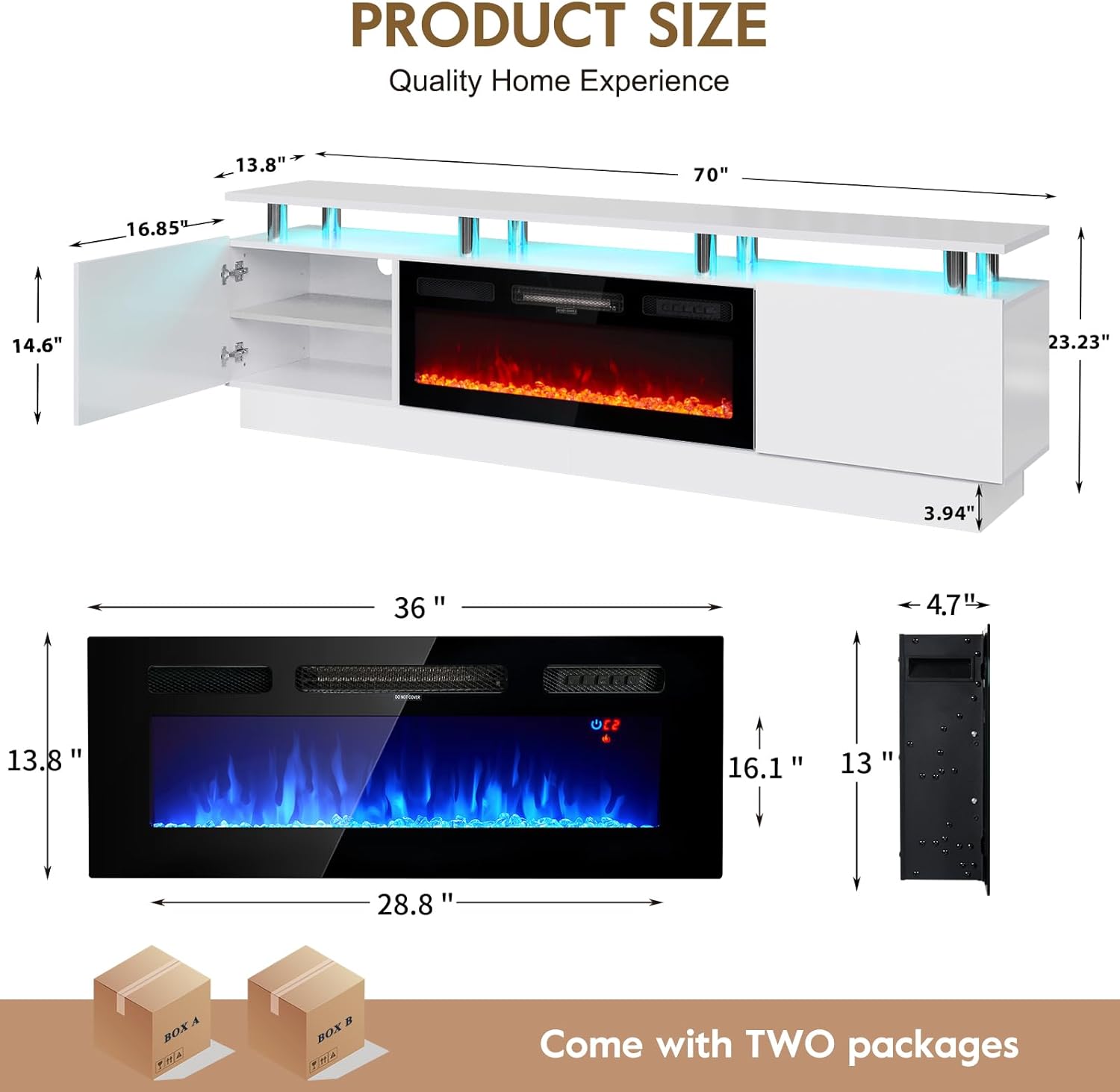 - TV Stand with 36" Fireplace: 70"L stand integrates 12-color electric fireplace with 5 dimmer levels & 36 LED color combos for a customizable viewing & heating experience.