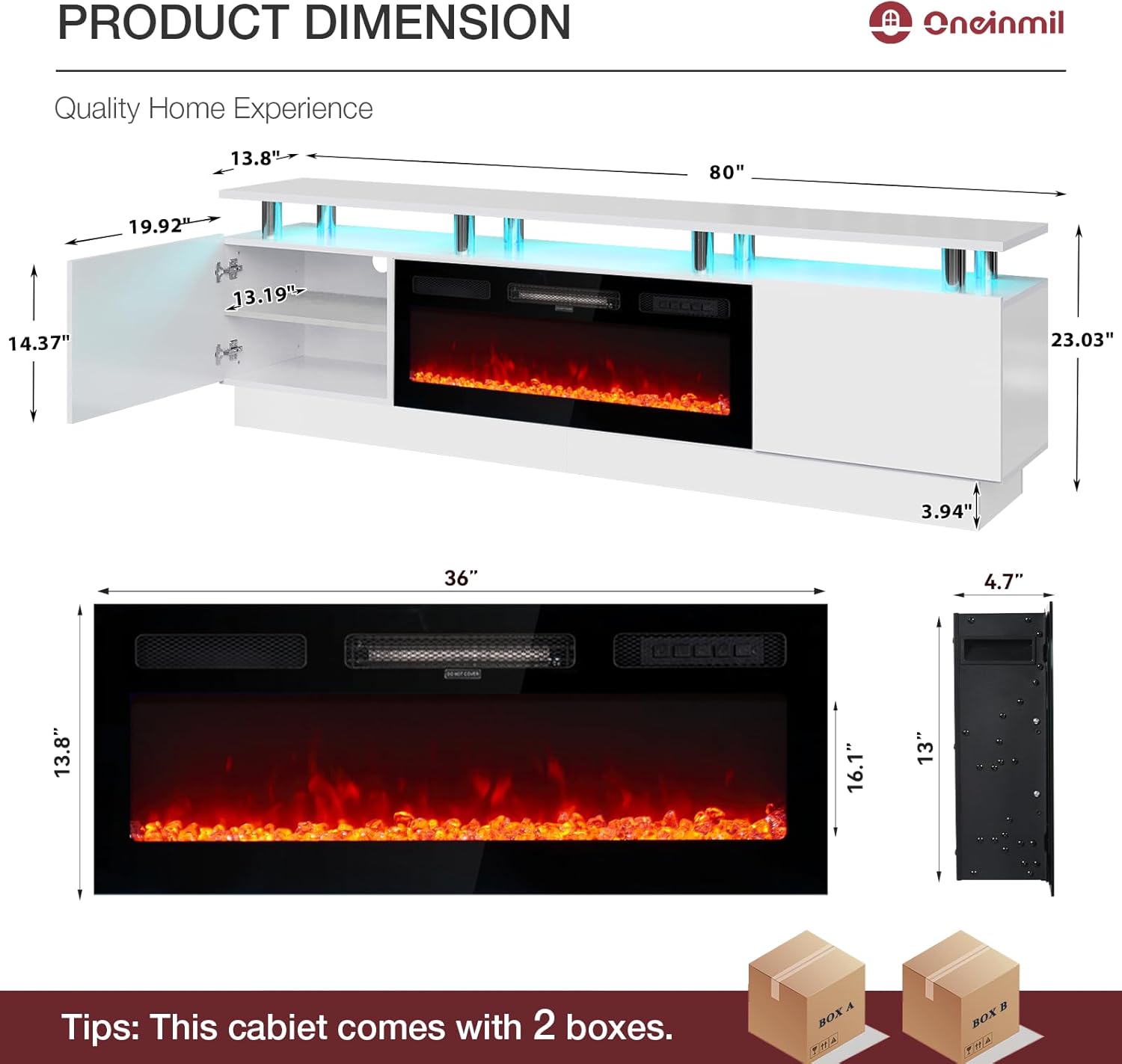 - TV Stand with 36" Fireplace: 80"L stand integrates twelve colors electric fireplace with five dimmer levels & thirty-six colors LED color combos for a customizable viewing & heating experience