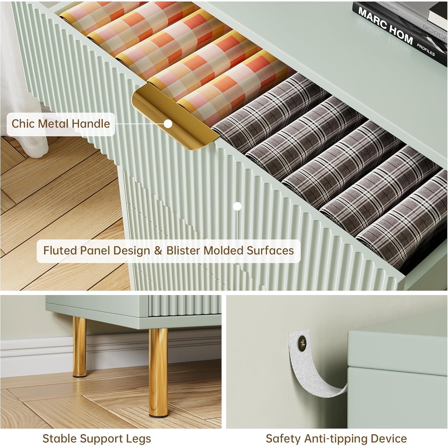 Green Dresser, Modern 6 Drawer Dresser for Bedroom with Gold Handle and Large Drawer, Wood Double Chest of Drawers and Storage Organizer for Living Room, Hallway, Entryway