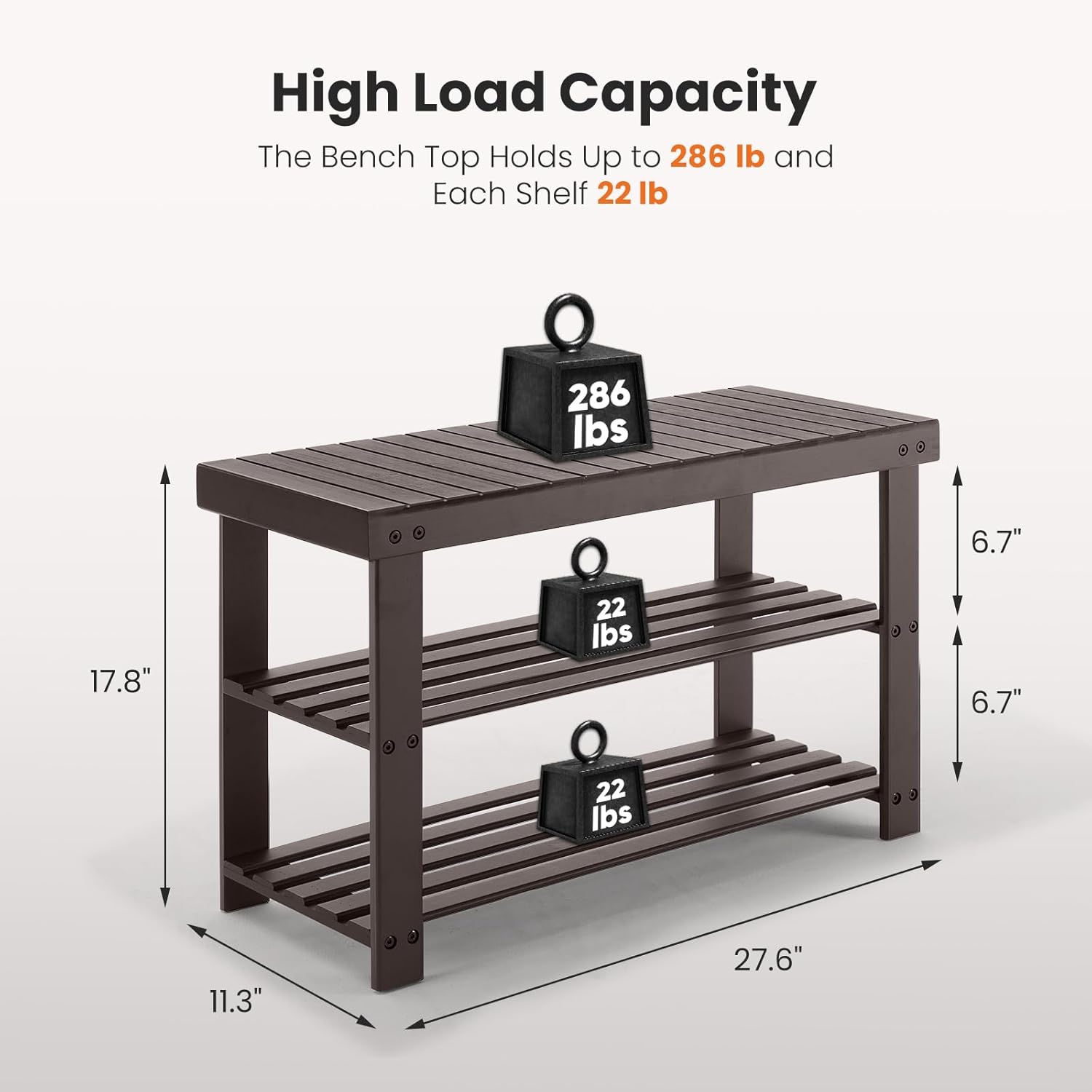 - 【Strong & Spacious Design】Measuring 11.3"D x 27.6"W x 17.8"H, the bench supports up to 286 lbs on the top seat, making it ideal for most adults. Each lower shelf can hold up to 22 lbs—perfect for shoes, bags, baskets, or other household essentials.
