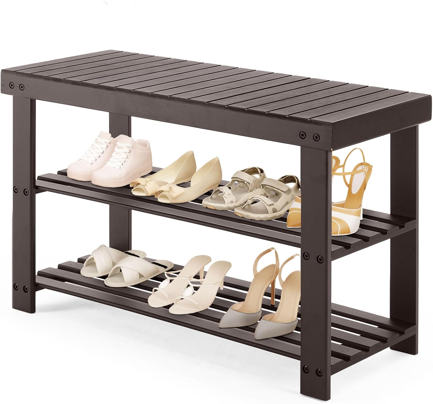 Sweetcrispy 3-Tier Shoe Rack Bench, Bamboo Entryway Storage Organizer, Shoes Stand for FrontDoor Entrance, Bedroom, Living Room, 286lb Capacity, 11.3 x 27.6 x 17.8 Inches, Chestnut