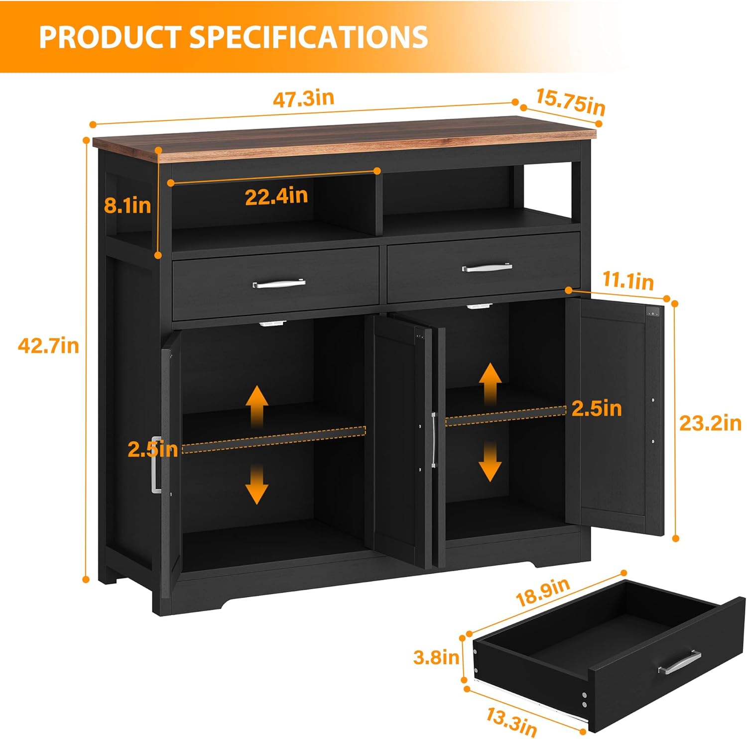 - Large Kitchen Storage Cabinet -The buffet cabinet showcases a wide tabletop, perfect for placing your coffee maker and microwave oven, while Three open storage spaces and the four-door cabinet can easily accommodate all your daily kitchen utensils. The shelf inside is 3-level adjustable to meet various storage needs.