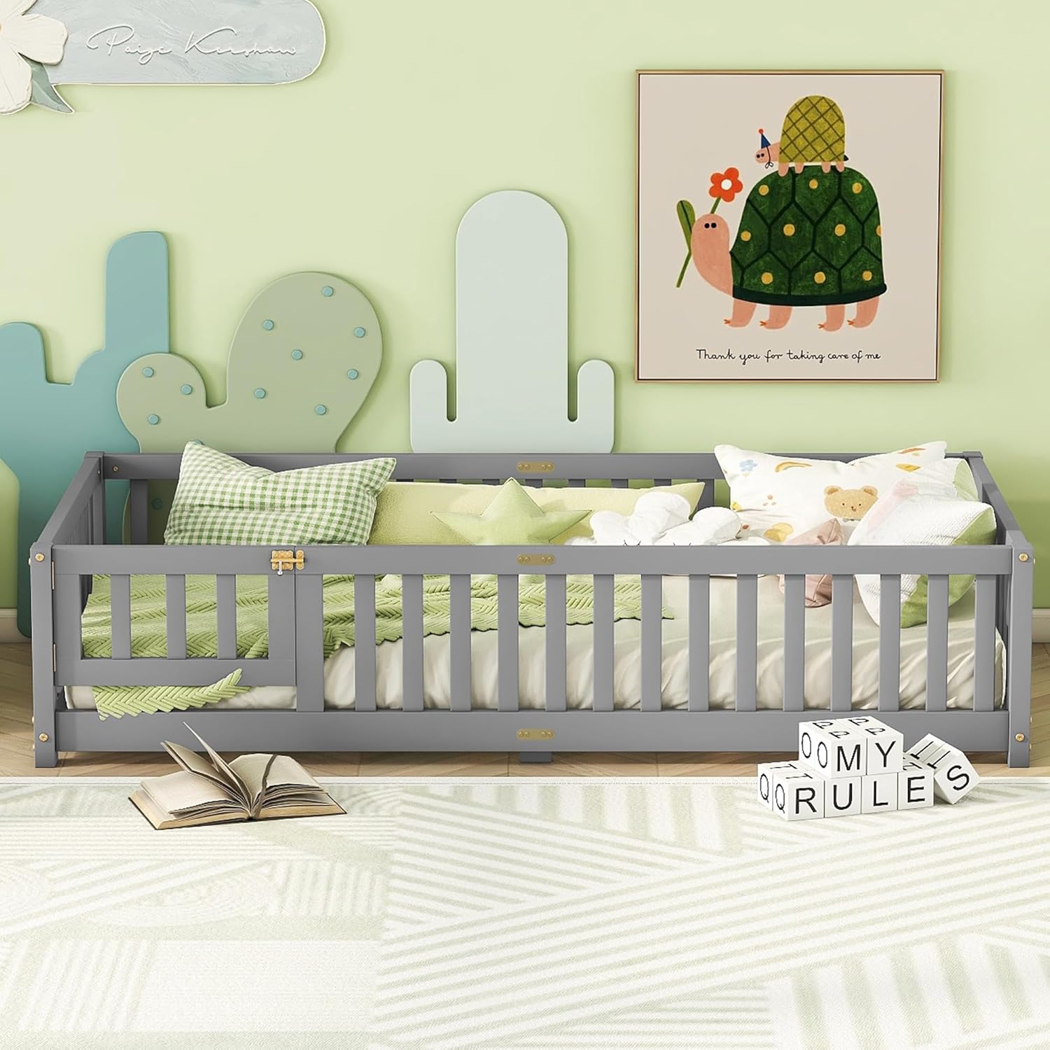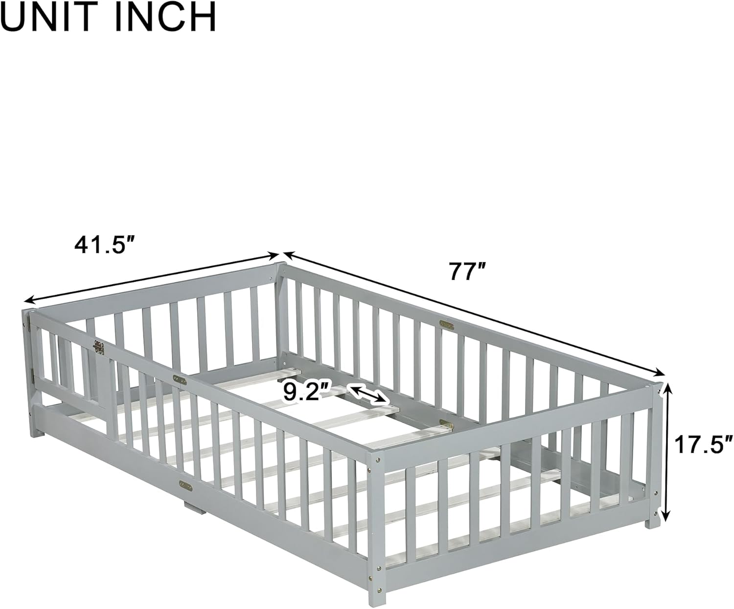 Bellemave Twin Floor Bed with Slats and Safety Guardrails, Kids Montessori Floor Beds with Fence and Door, Easy Assemble Floor Bed for Kids, Girls, Boys, Gray