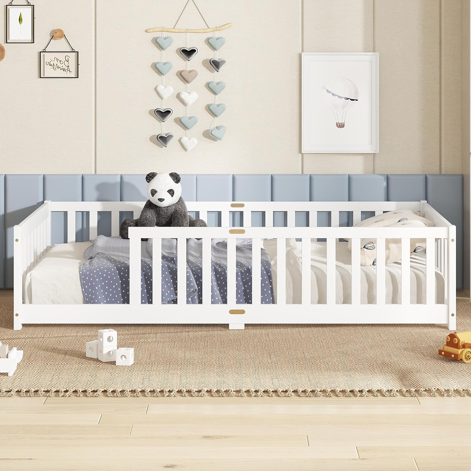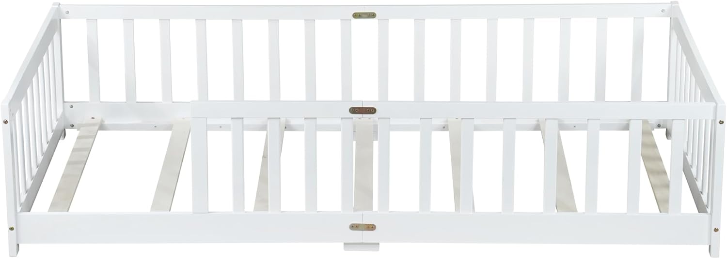Bellemave Twin Floor Bed with Slats and Safety Guardrails, Kids Montessori Floor Beds with Fence and Without Door, Easy Assemble Floor Bed for Kids, Girls, Boys, White