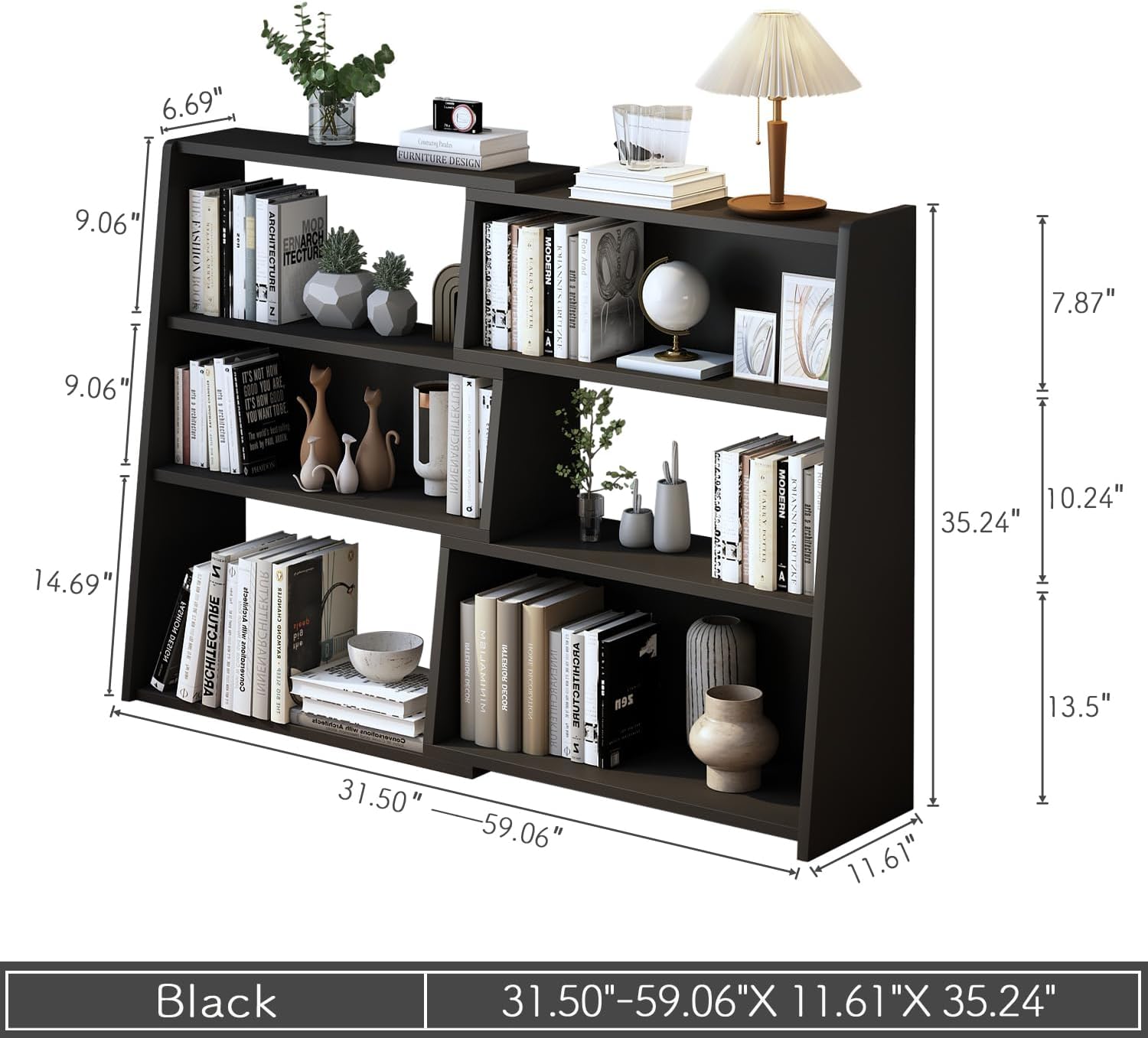 - DIMENSIONS: The size of this short bookcase is 31.5 "W (extends up to 59.1") x 11.6 "D x 35.2 "H. We provide detailed installation instructions so you can assemble them quickly. If you have any questions, please feel free to contact us.