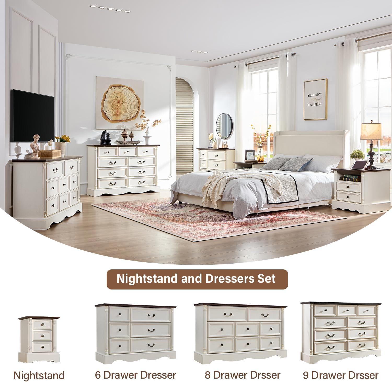 Farmhouse 9 Drawers Dresser for Bedroom with Charging Station, 54" Wide Wood Country Rustic Storage Dressers Organizer, Vintage Design Chest of Drawers TV Stand, Antique White