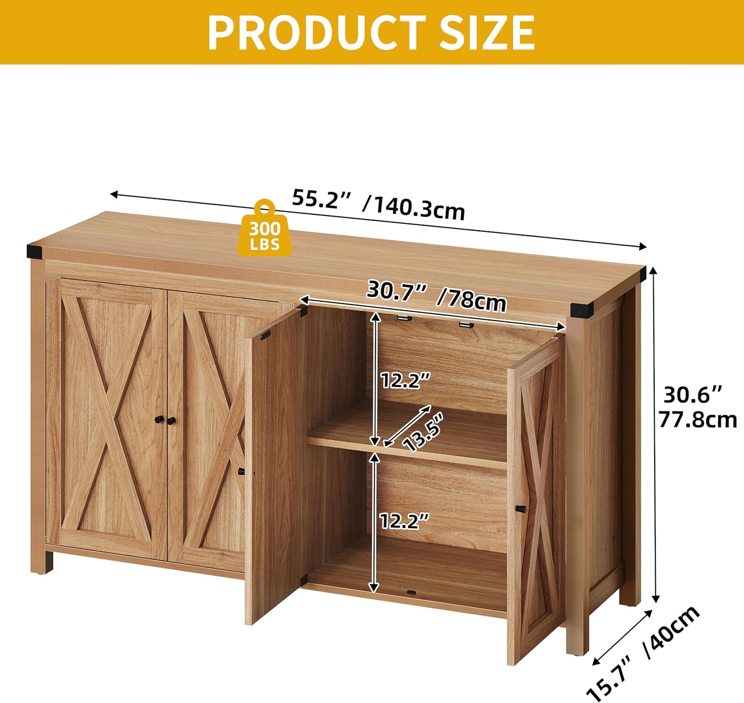 - Ample Storage Space: The sideboard cabinet features 4 doors cabinet with adjustable shelf to meet your storage needs, while the 55" wide tabletop creates an accessible way to display microwave, toaster, and coffee makers