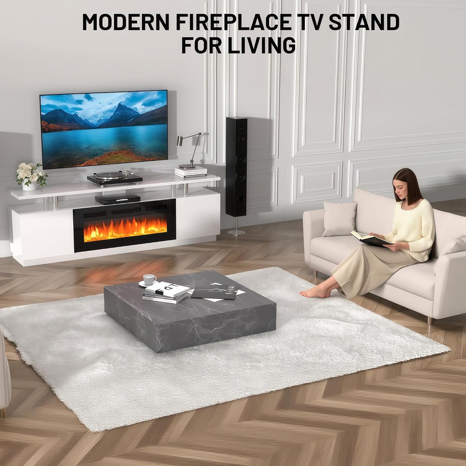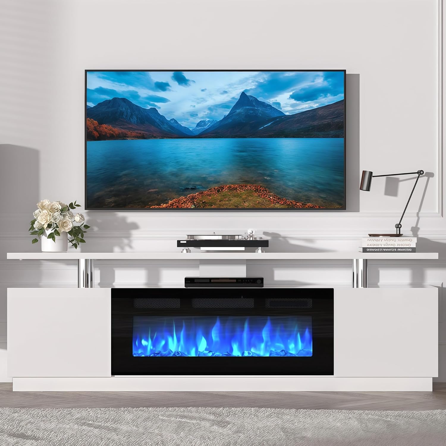 - 【2-in-1 Versatile Design】 70" TV stand with built-in 36" electric fireplace, supports TVs up to 80". Features a 300-lb weight capacity, MDF+iron frame+tempered glass construction, adjustable shelves, and cable management. Two glossy storage cabinets add modern style to any living space.